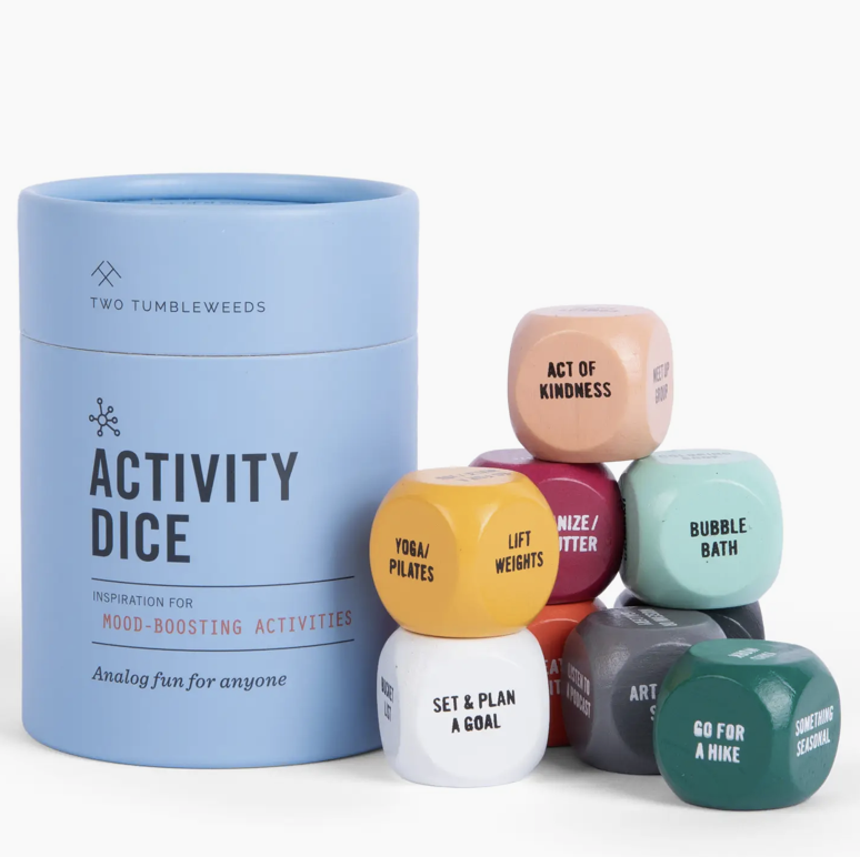 Feeling stuck or bored? Let Activity Dice be your remedy! These 54 carefully curated analog activities will feed your mind, body, and soul—and provide a perfect excuse to step away from screens. Whether it’s visiting a library, baking bread, or crafting a vision board, each roll promises a new experience. Play solo or with friends to create connection, elevate your mood, and bid farewell to boredom—one roll at a time!