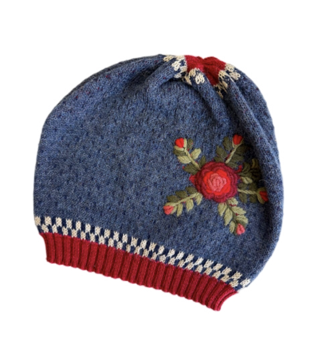 Amira Embroidered Alpaca Hat – Available in Blue, Charcoal and Turquoise 100% Alpaca hat with beautiful floral embroidery – fits most heads Cable knit in 100% Alpaca. Hand wash cold water, mild soap, lay flat to dry. Coordinates with matching Amira Hand warmers under the Hand Warmer category