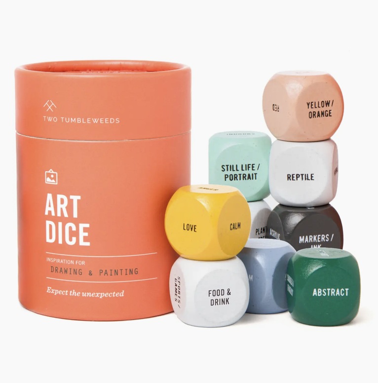Art Dice—the solution to Artist’s Block. When faced with a blank canvas, it can be hard to know where to start. Whether you’re an artist, a teacher, or you just want to dabble with drawing or painting, Art Dice can help you find inspiration, develop your skills, vary your style, or collaborate creatively with others. With thousands of combos, you’re bound to encounter something unexpected and different.