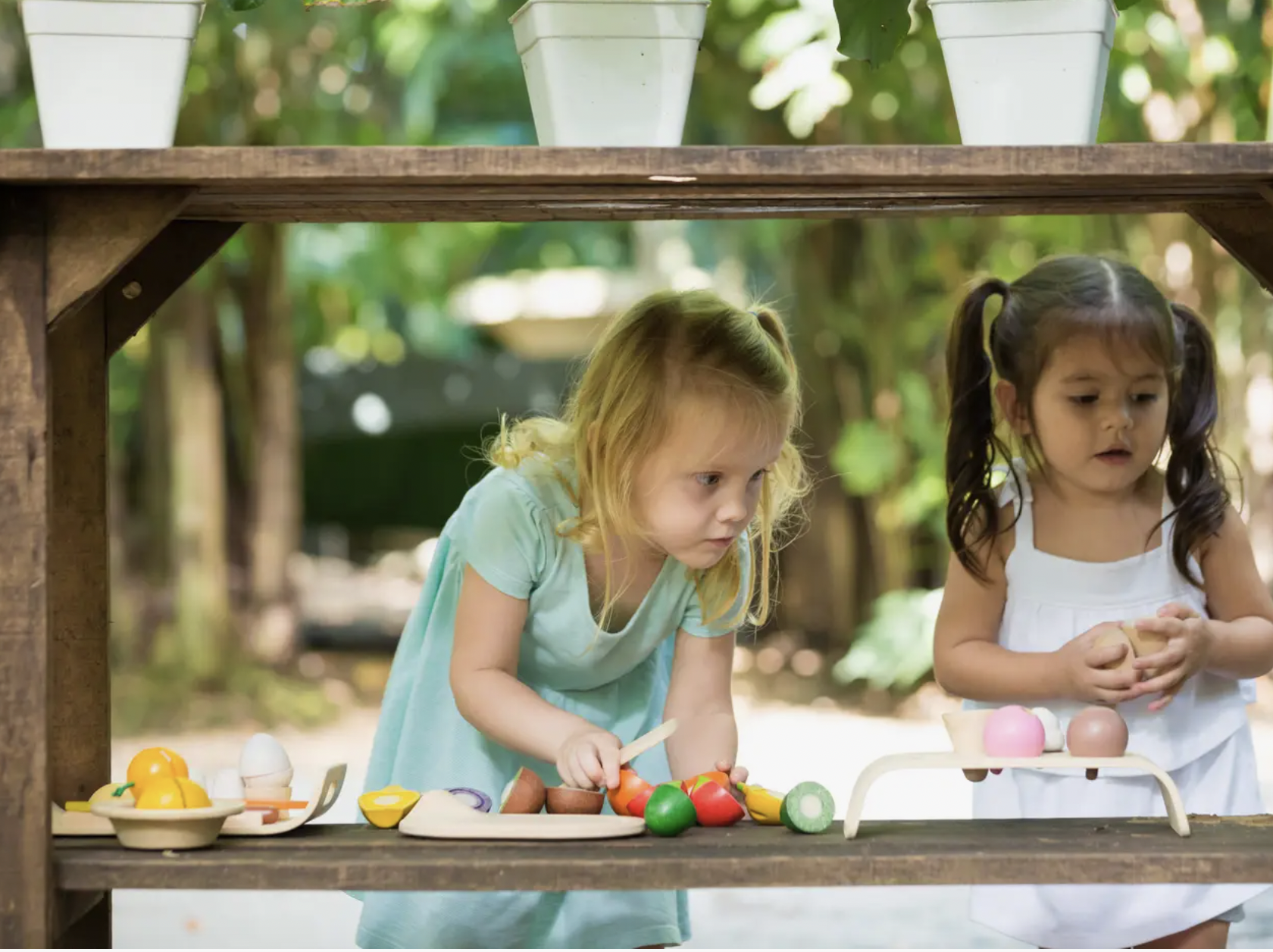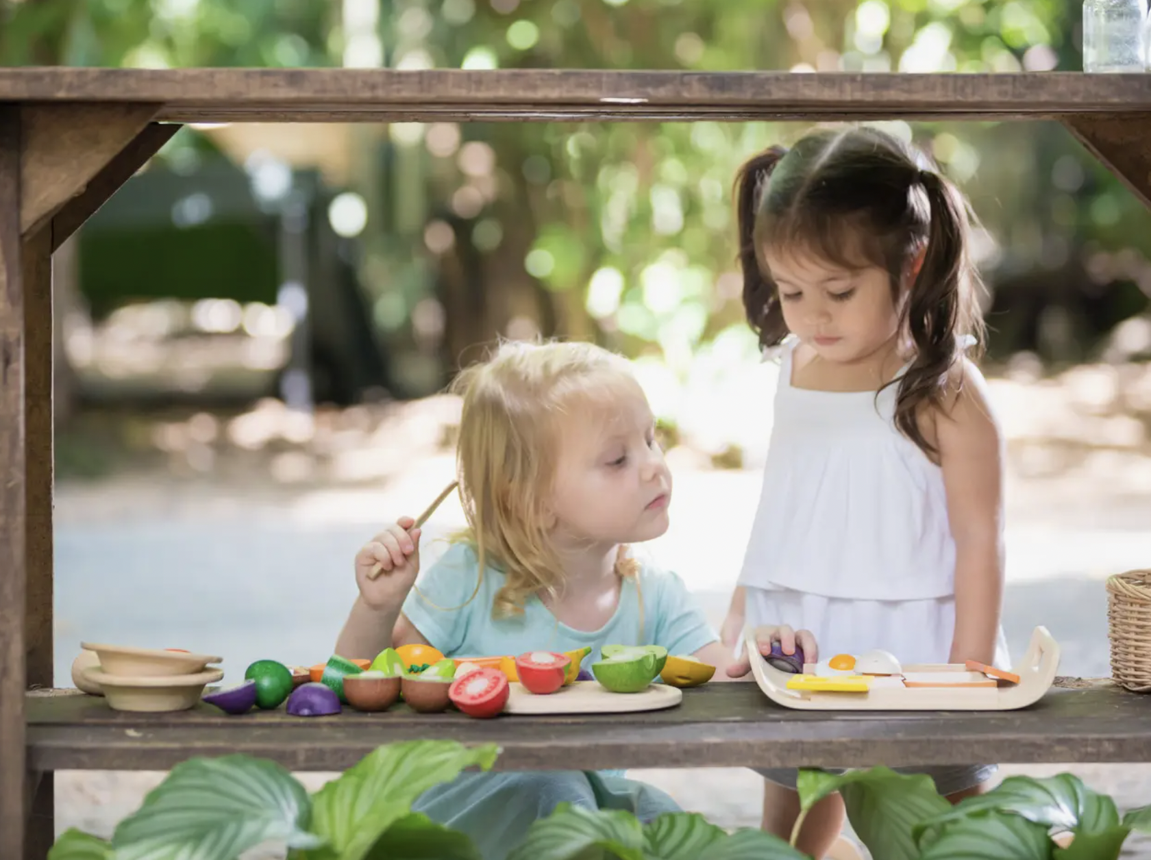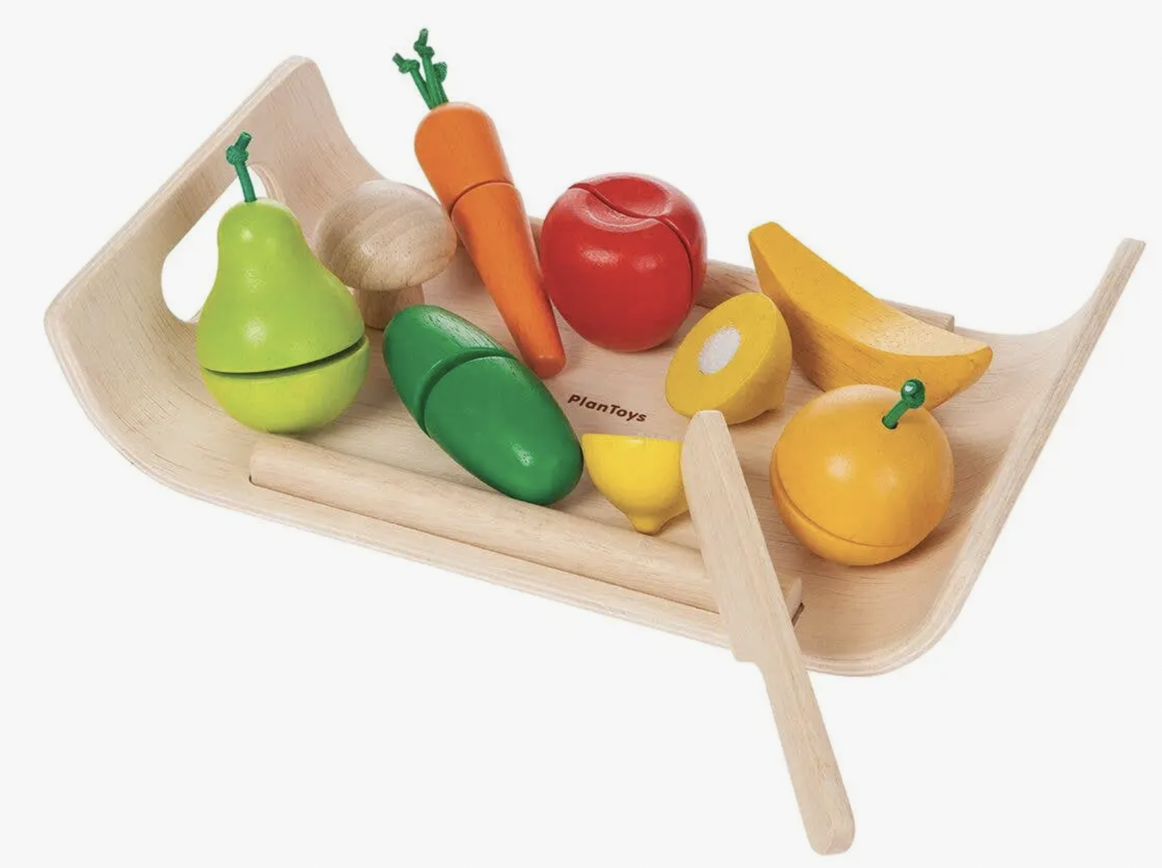 The set includes an apple, a pear, an orange, a banana, a cucumber, a mushroom, a carrot, a knife, and a tray. This toy set is a fun way to introduce children to cooking!