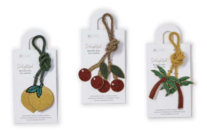 Elevate your bag flair with the charming 2Chic Bag Tie Charms. Handcrafted with exquisite attention to detail, these assorted bag tie charms come in three captivating shapes; palm tree, cherries, and lemons and add a touch of whimsy to any bag. Handmade with glass and cotton, each piece showcases beading and emellishment that evoke a sense of warmth and style.