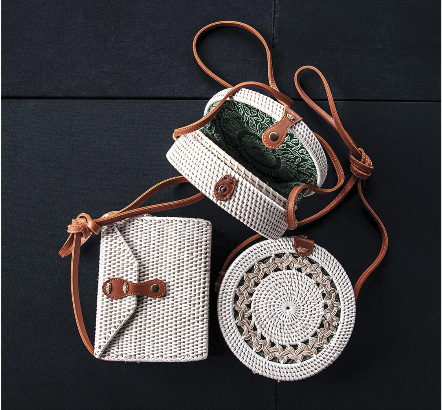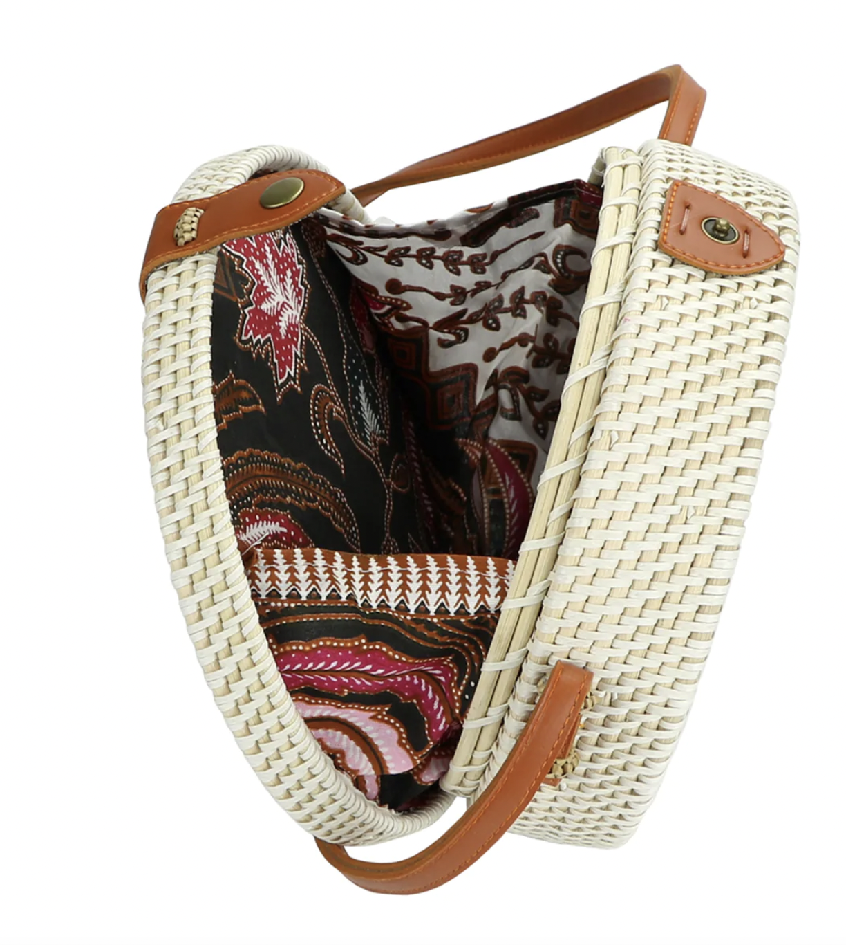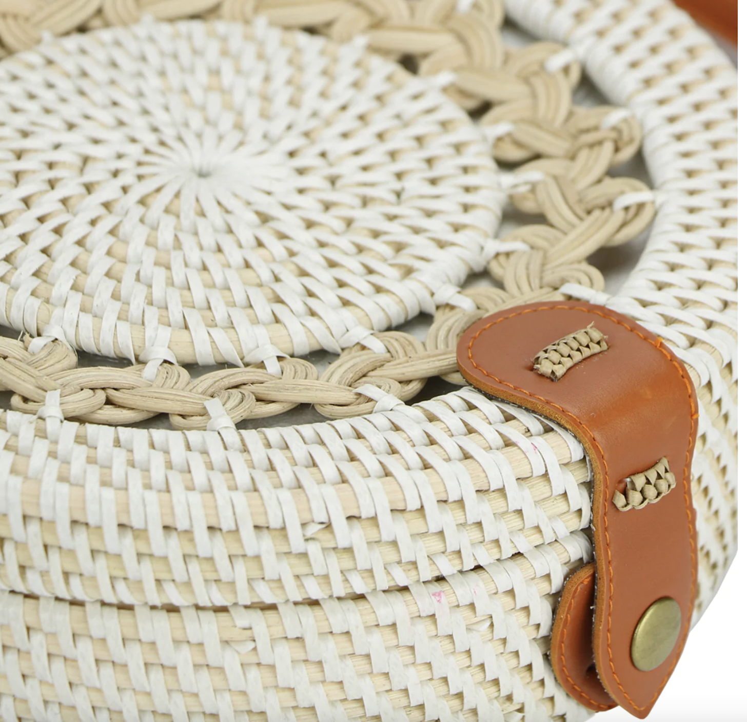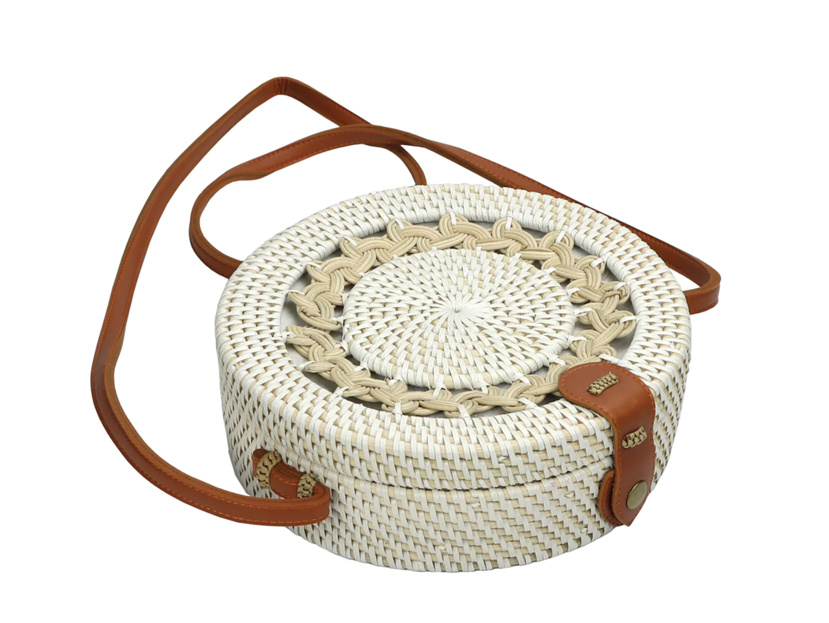 Made of woven rattan and natural fibers, the Bali Bag, Round comes in two styles —with a decorative floral “lace” and one without. These round bags are great for short sojourns or for social outings.