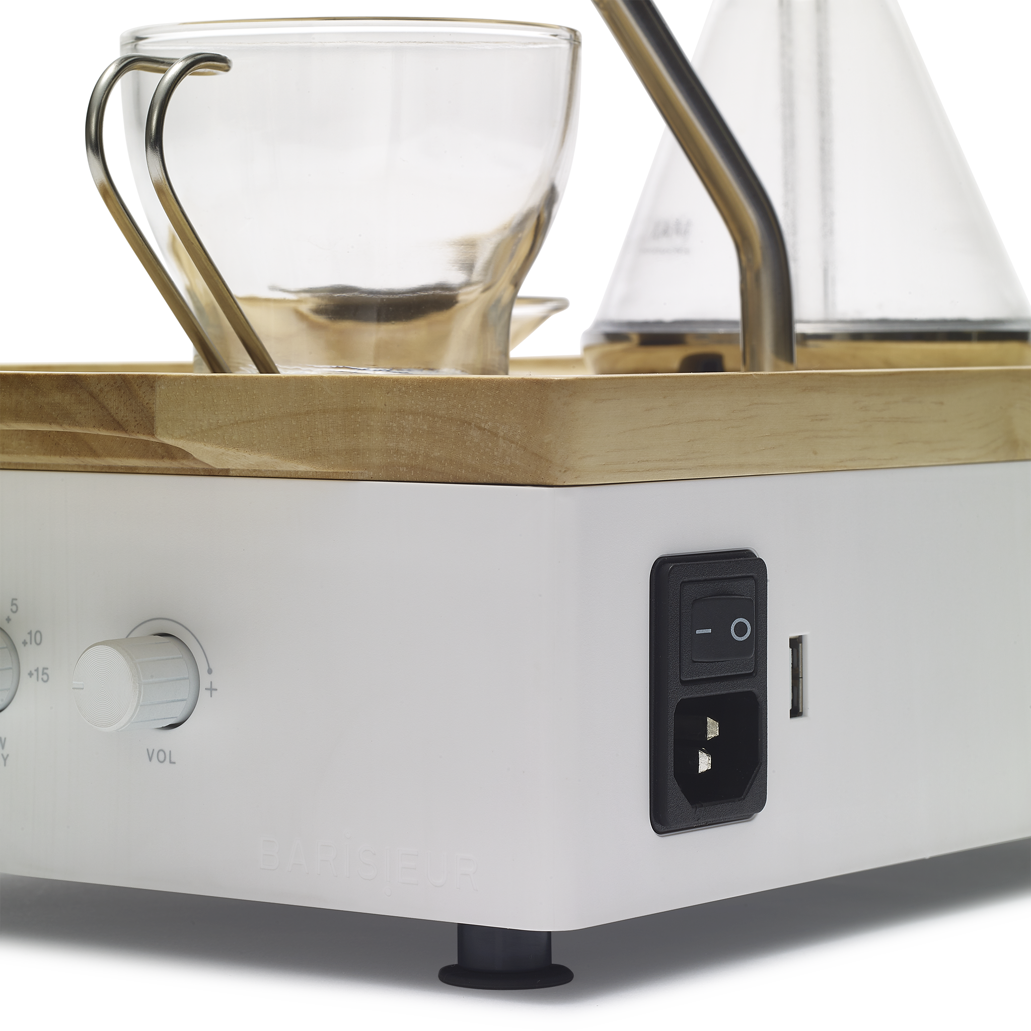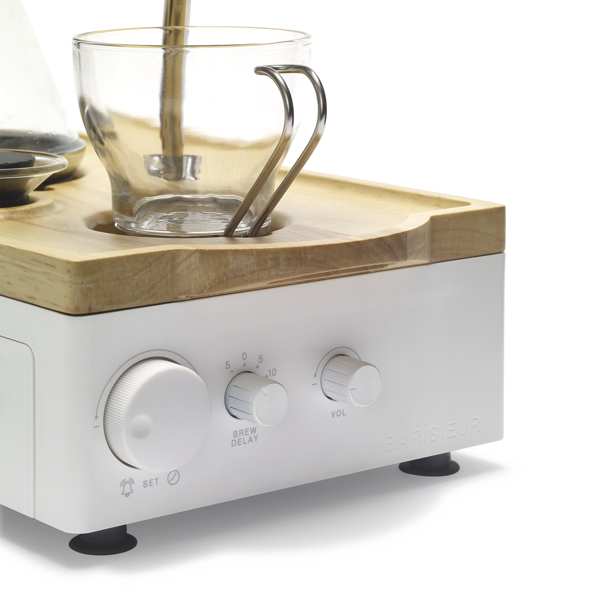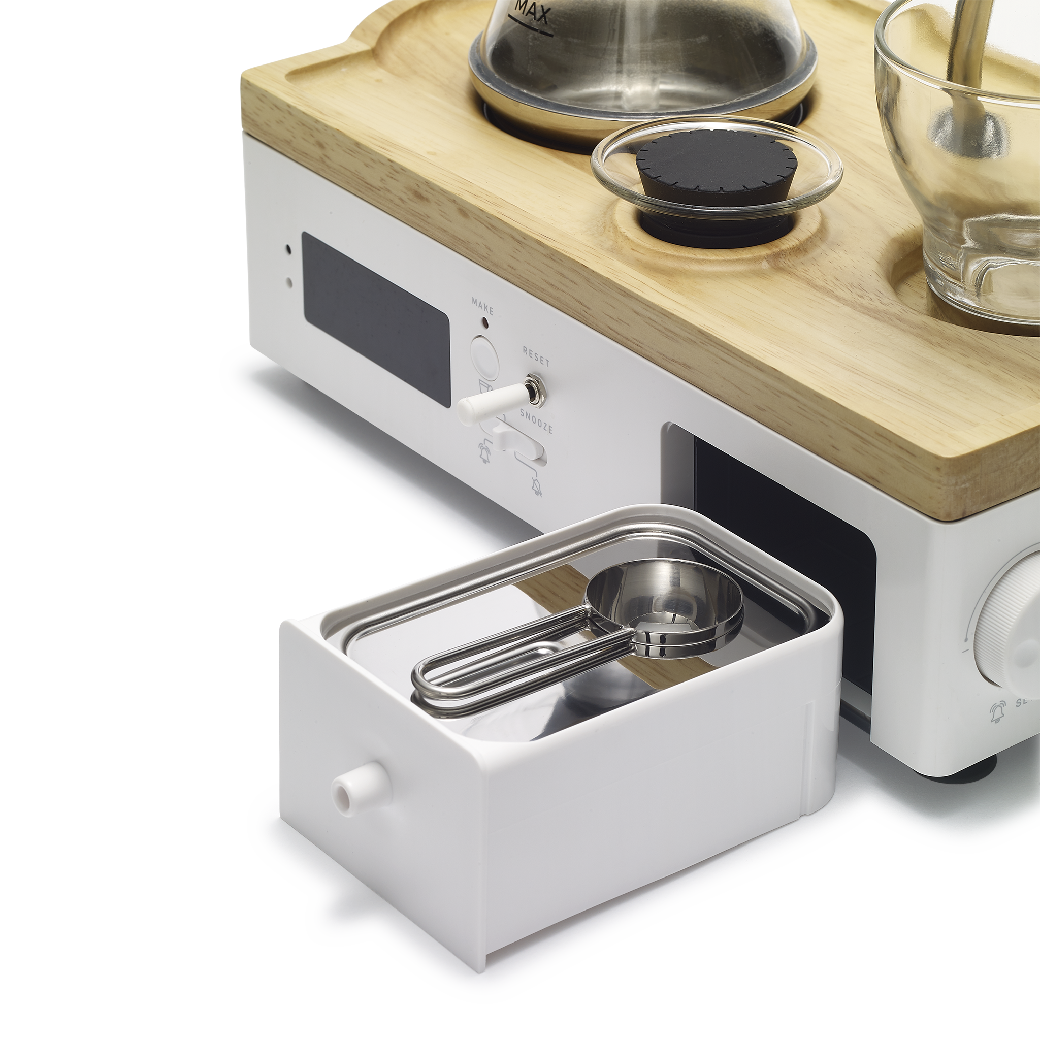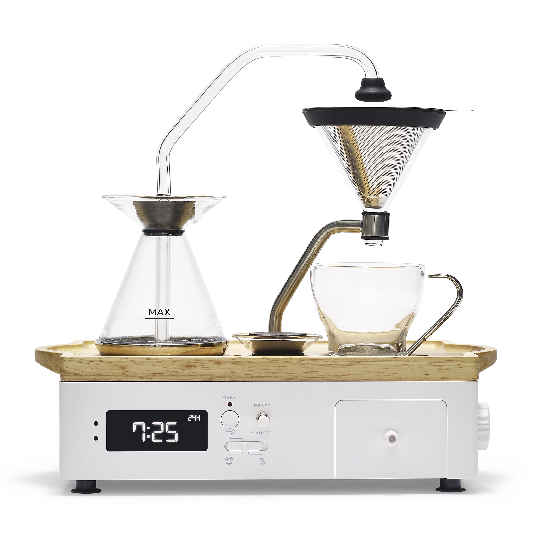 Brew the perfect cup right when you wake with Barisieur’s ingenious alarm clock. Whether you’re a coffee or tea person, this innovative design has you covered with the capability to brew pour-over coffee or loose leaf tea first thing in the morning when its alarm goes off, even storing your milk in a refrigerated compartment to keep it chilled + fresh, activated by an infrared sensor. Comes with glassware resting on a walnut tray and plastic base. Features drawers for storing your essential ingredients. All you have to do is set it up the night before and you’ll wake up to the perfect cup!