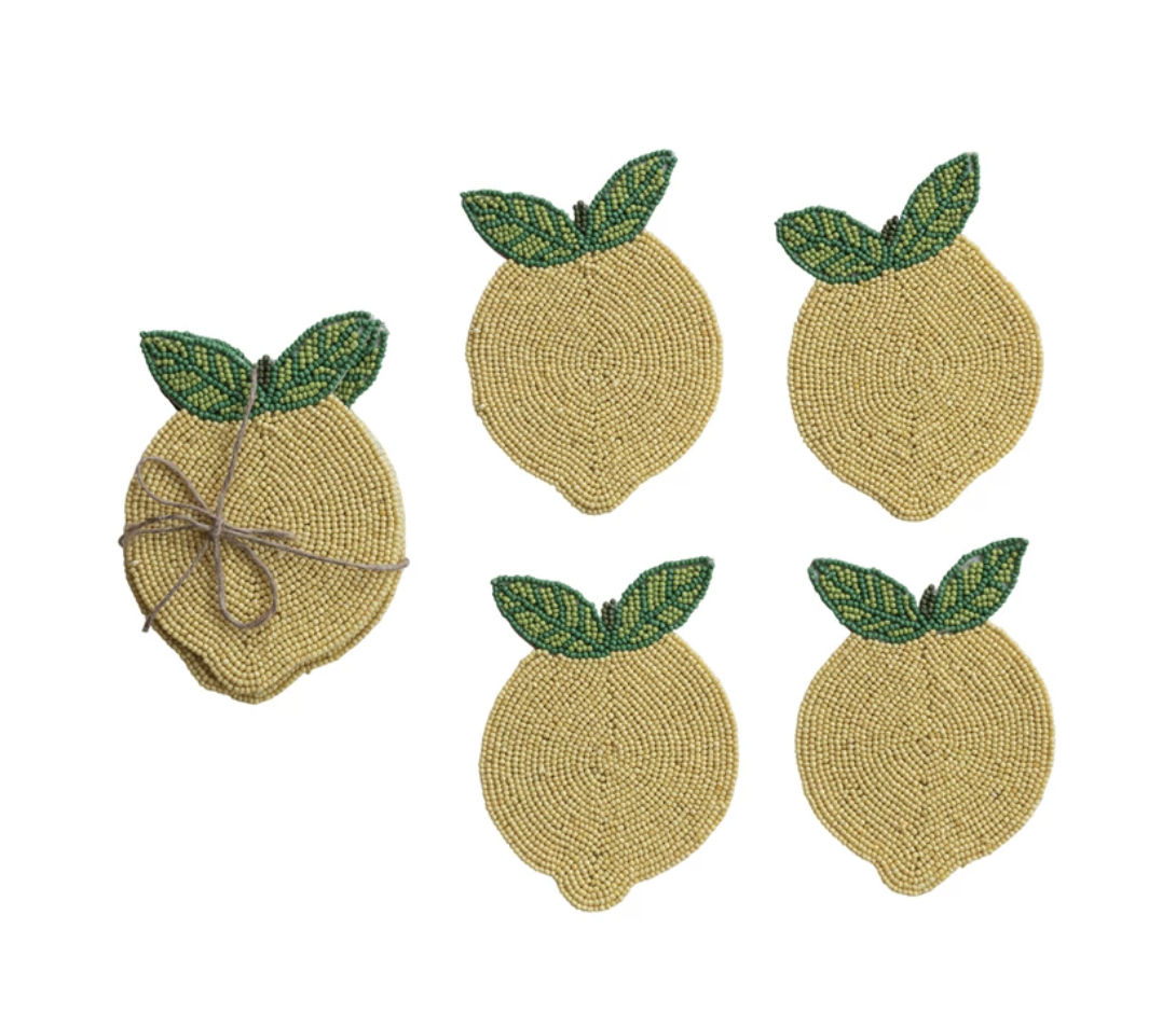 5″L x 3-1/2″W Handmade Beaded Lemon Coasters, Yellow & Green, Set of 4 Tied w/ Jute