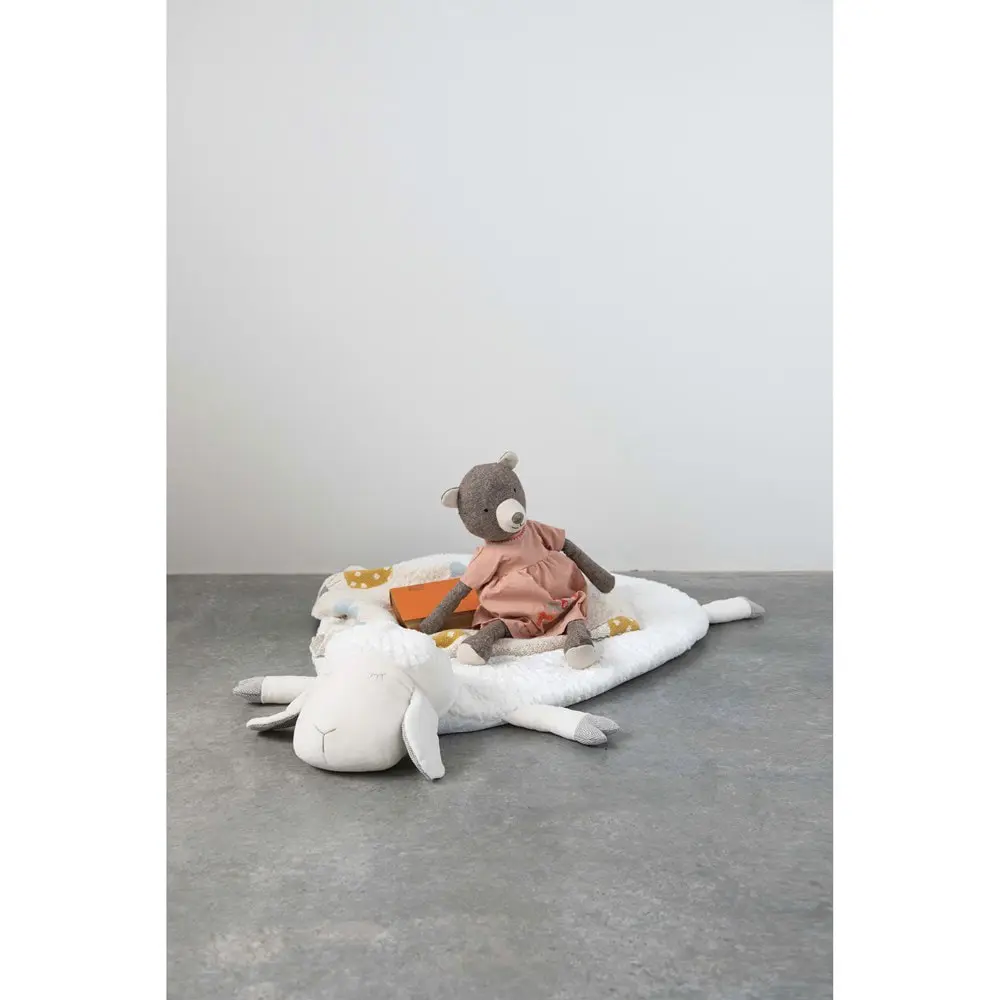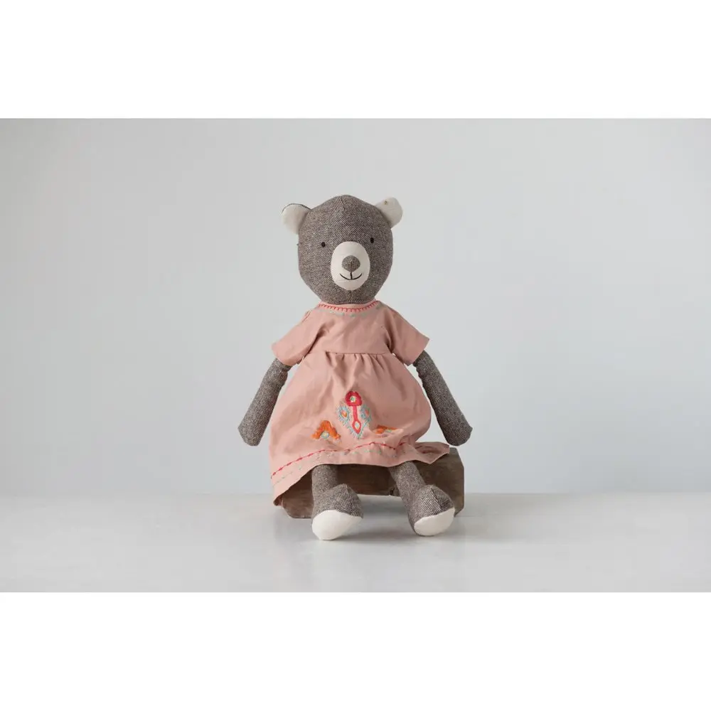 We love this adorable bear with an embroidered pink dress that is sure to create a smile so large it will stretch from ear to ear. Your little one will enjoy playing and carrying it all around. Dress is removable.