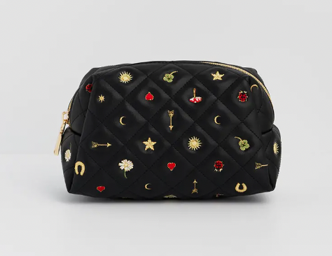Elegant and versatile, the Black Quilted Floral Motif Embroidered Pouch is perfect for carrying your small essentials in style. Crafted from smooth PU with a quilted finish and detailed floral embroidery, this pouch blends sophistication and practicality ideal for both everyday use and travel organisation. Style: Cosmetic Pouch Colour: Black Material: Smooth faux leather Structure: Compact design suitable for accessories or cosmetics Closure: Secure zip fastening Approx. 15 (L) x 10 (H) x 8 (D) cm Approx. 5.9 (L) x 3.9 (H) x 3.1 (D) in Outer: 100% Polyurethane (smooth faux leather) Lining: 100% Polyester Care: Wipe clean with a soft cloth
