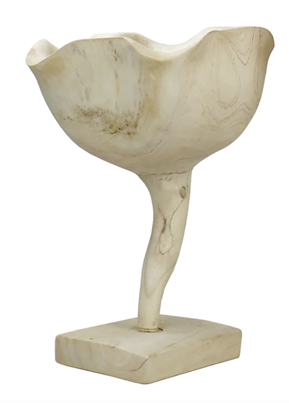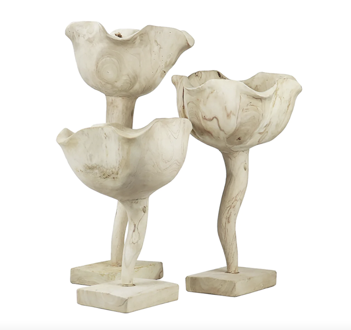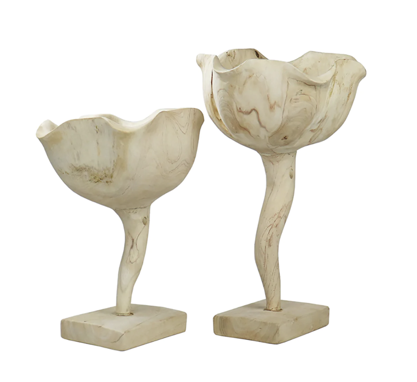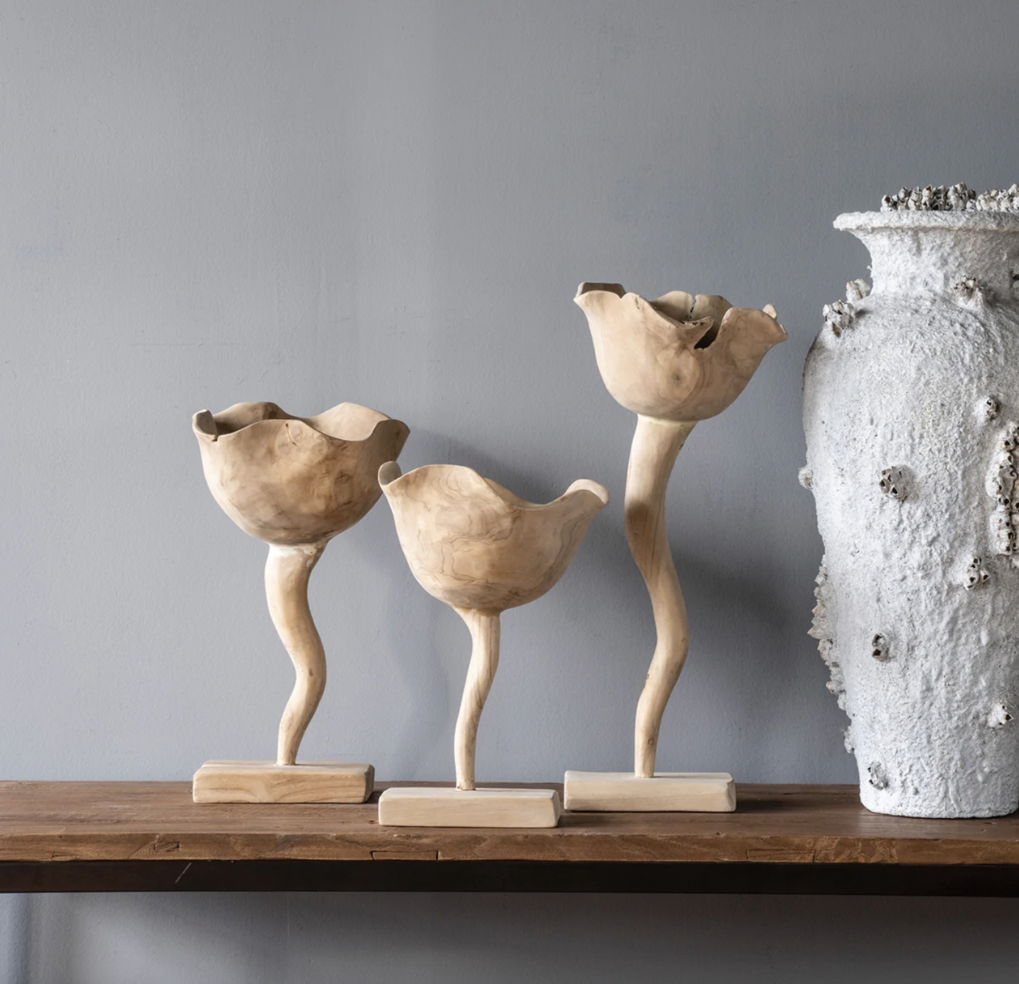 Our goblet shaped Blossom Statues take inspiration from a tulip in full bloom. The organic lines of the blossom and stem make these hand-carved, teak wood accents give it sensuous appeal. The Blossom statue comes in three sizes making for a delightful tiered display when placed in a group. Available in Small, Medium and Large.
