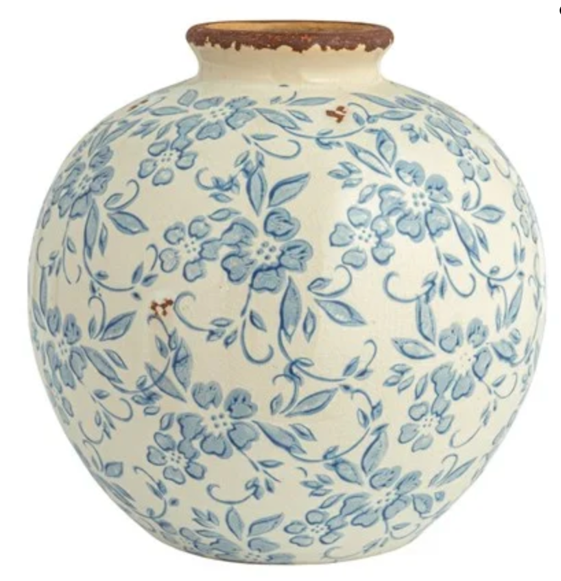 Showcasing artful antique detailing and a traditional transferware pattern, this terracotta vase pays homage to classic ancient pottery. Ideal for the sophisticated decor, it will enhance an already luxurious setting. Display it alone or with a selection of dried blue botanicals.
