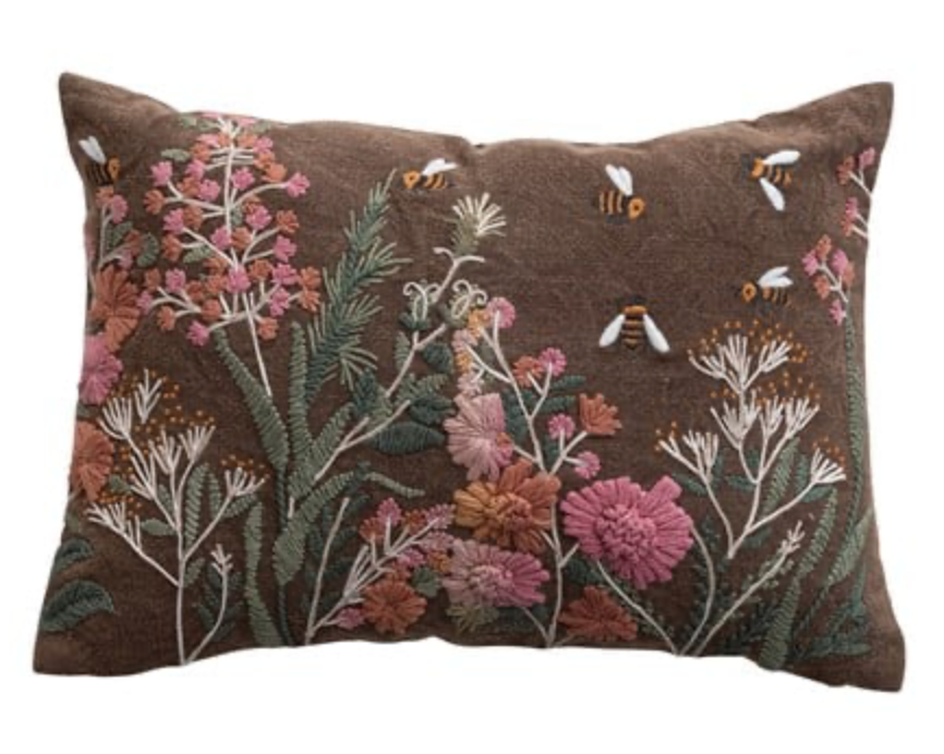 Featuring an intricate embroidered design of a flower and bee, this pillow combines artistry with functionality. Crafted from soft, durable materials, it serves as a unique decorative accent for any living space.