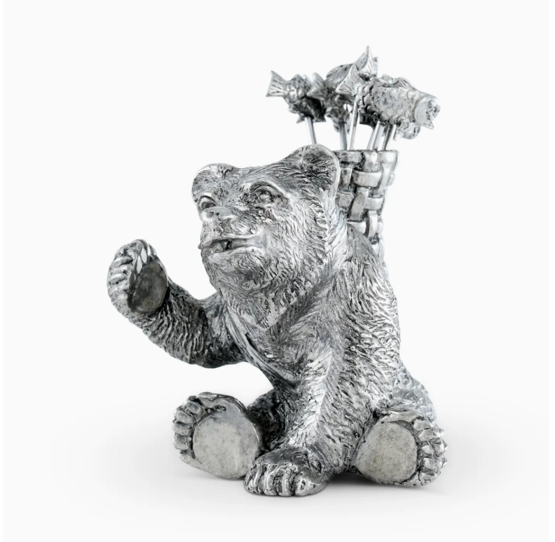 This chubby little pewter bear has a back pack full of fish and is ready to go camping on the nearest cheeseboard! The cheerful Vagabond House Camping Bear Cheese Pick Set is packed with detail, the sweet young bear has a smile and wave for all, his backpack basket holds 6 pewter fish topped picks. Vagabond House’s Woodland Creatures Collection brings happy home. Spunky squirrels, playful bears and curious raccoons are among the whimsical pewter forest dwellers frolicking on natural log, acacia wood, fine stoneware and glass creations designed to bring smiles to your table and home. Size: 2.5″ L / 2.5″ W / 3″ T Care: Hand wash only and wipe dry with soft cloth
