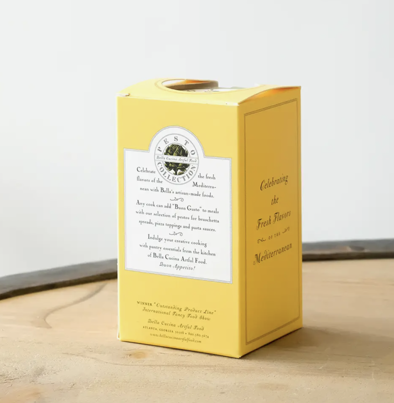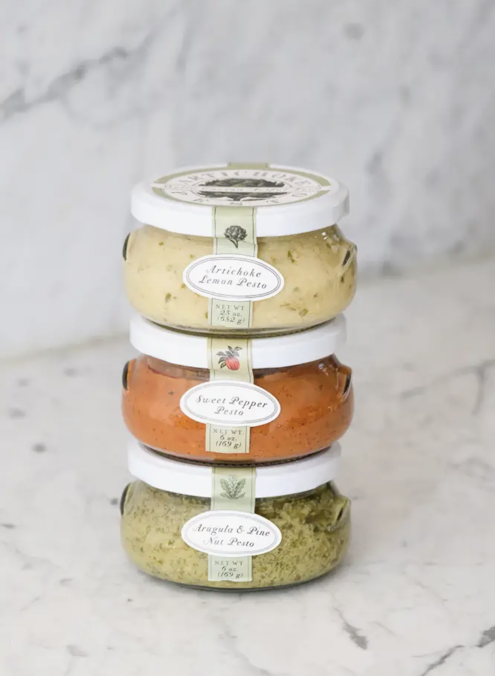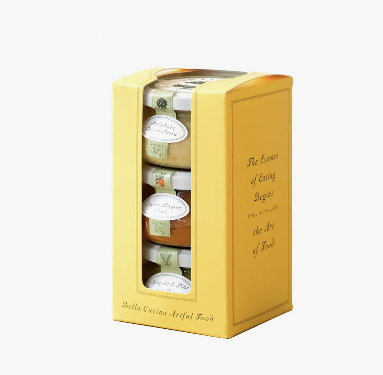 The chef’s personal favorites –A yellow gift box holds three-6oz. jars of pesto in our most unique flavor combinations. Recipe suggestions on each jar. Includes Sweet Roasted Pepper, Artichoke Lemon, and Arugula Pine Nut.