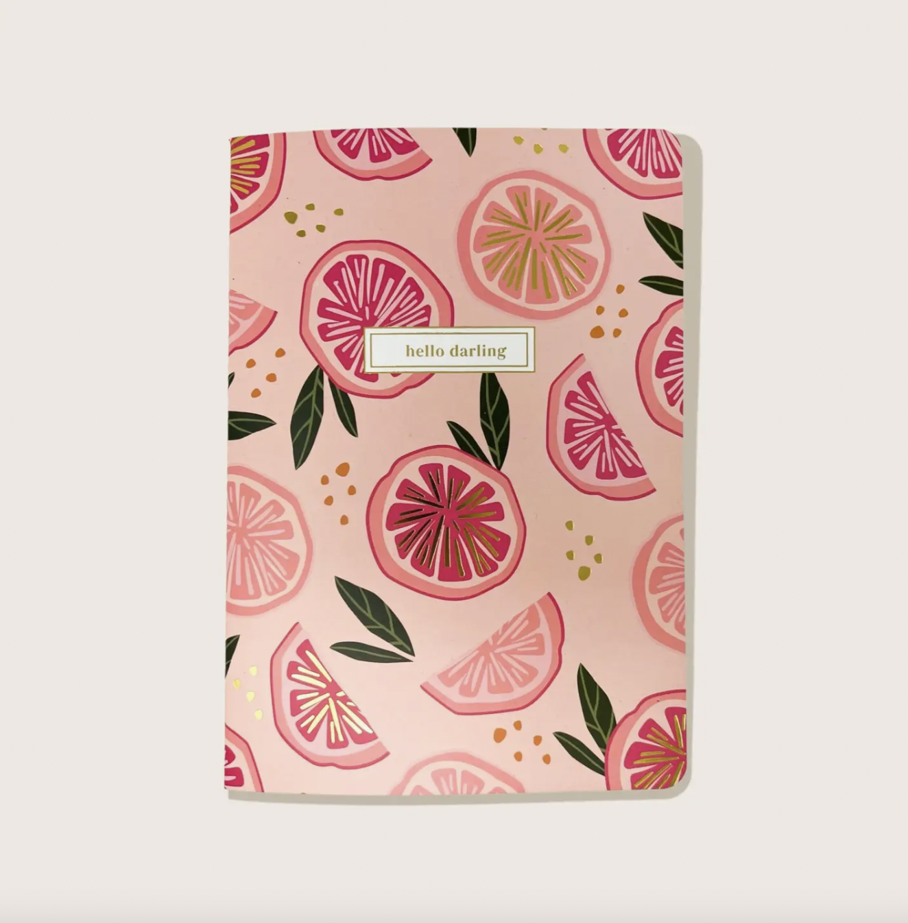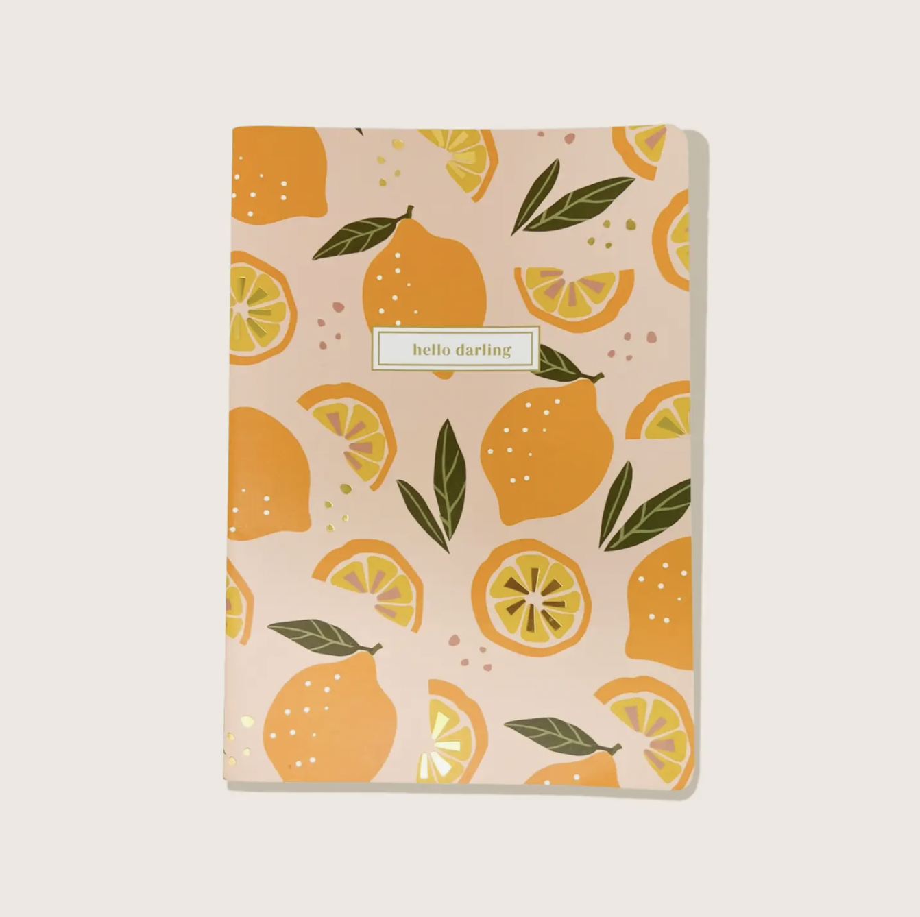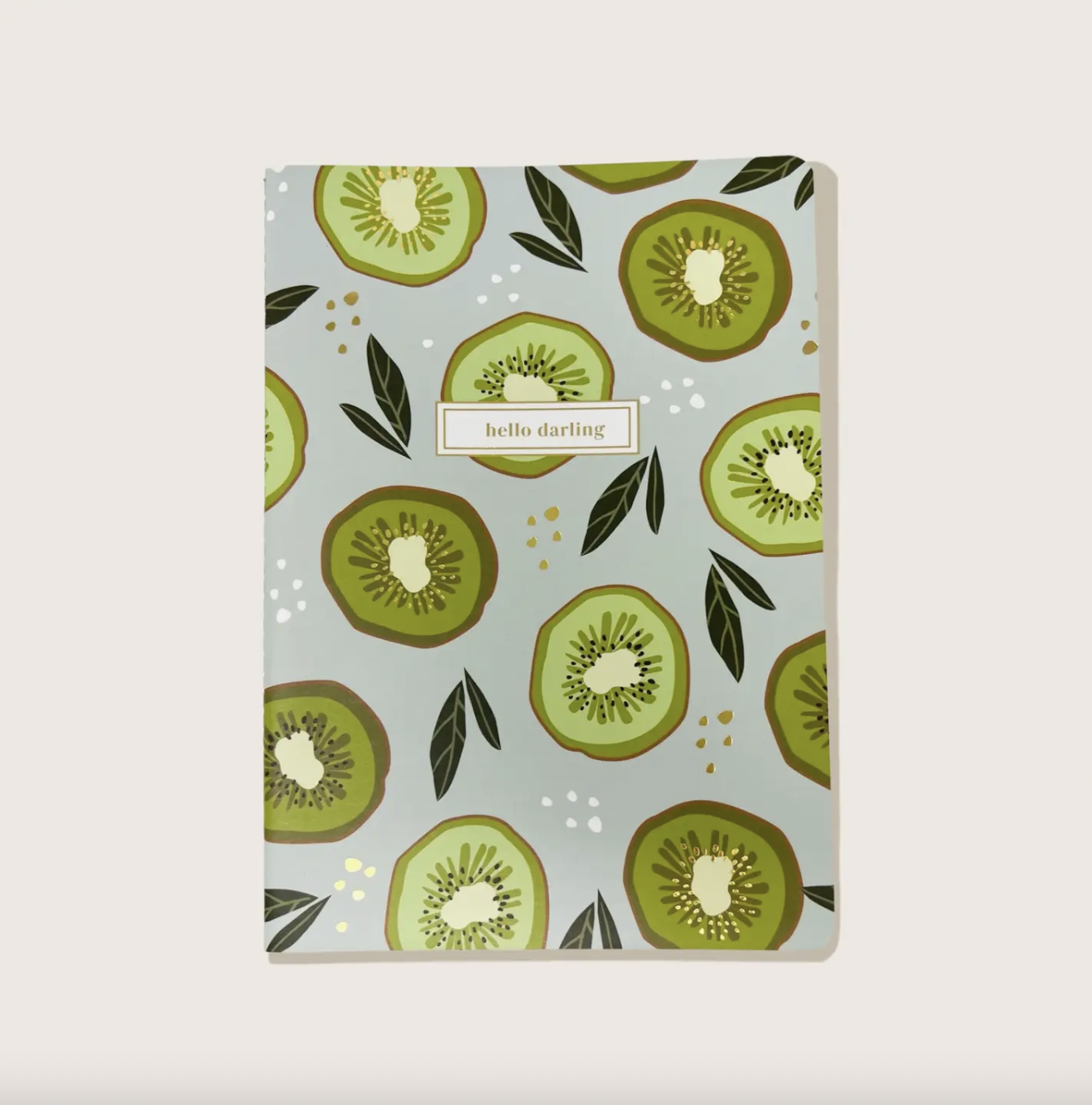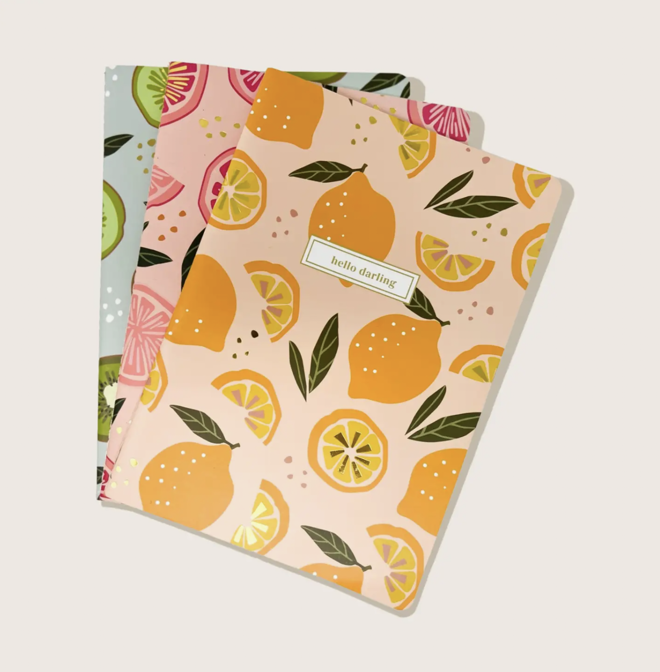 Set of 3 citrus notebooks: includes 1 lemon, 1 kiwi, and 1 grapefruit notebook. Unique citrus design and pattern. With soft touch and gold foiled covers, this is the cutest notebook to add to your school or office collection! Each set is banded together with soft touch paper that lists details about the notebooks.