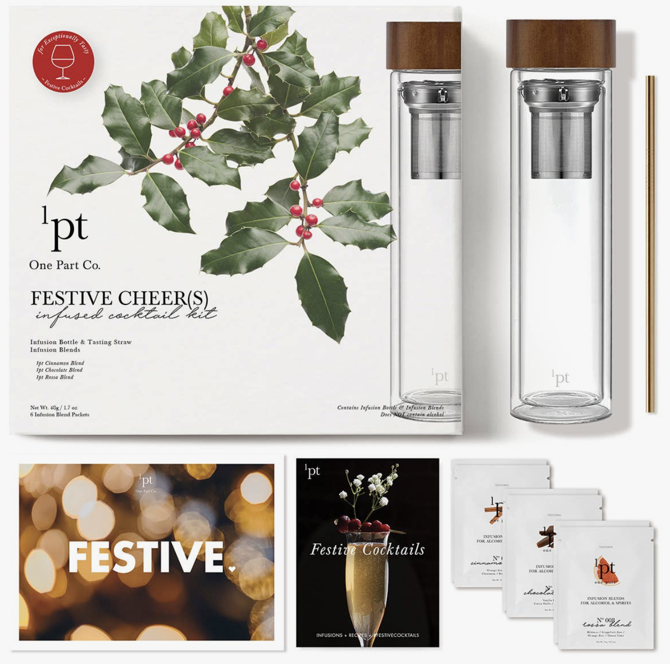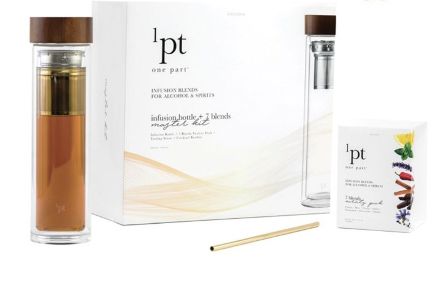 Whether you are an experienced mixologist or just starting to explore the world of infused spirits, the Master Kit is a must-have. Our high-durability lab glass infusion bottle with walnut-finish cap infuses 375 ml of liquid (half of a standard bottle of spirits). It features a removable stainless steel infusion basket ready to hold a single packet of any 1pt infusion blend, included inside. You also get a reusable, gold-finish, stainless steel tasting straw so that you can taste-test during the infusion process, a simple instruction guide, and some cocktail suggestions to start you off in the right direction.Included 1x Infusion Bottle: Walnut-Finish Cap, Glass, 500 ml / 16 fl oz1x Tasting Straw: Gold-Finish, Stainless Steel, 215 mm / 8.5 in length1x 1pt Variety Pack: Made in USA, One packet each selected 1pt Infusion Blends: Citrus, Mint, Floral, Chili, Cinnamon, Chocolate, Smoky 1x Cocktail Booklet