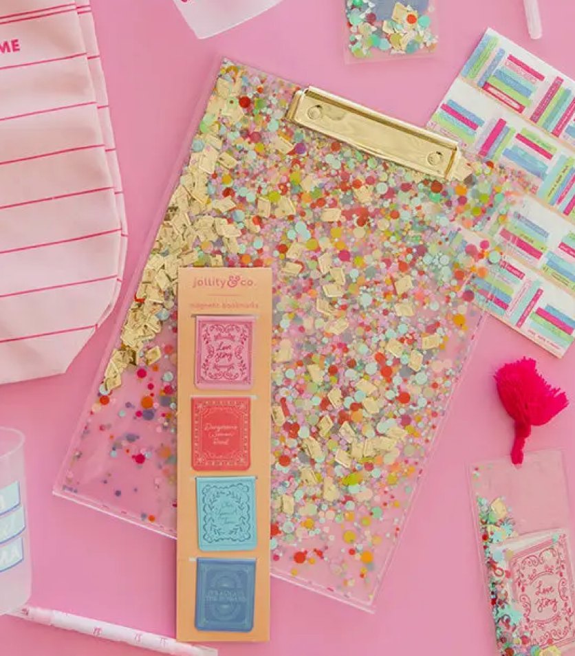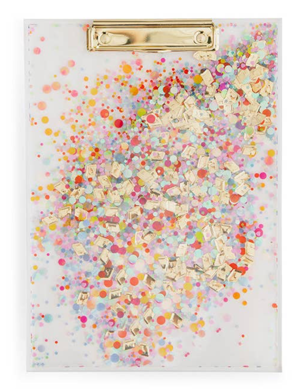 Acrylic clipboard with book-themed confetti and gold metal hardware 12.75 in x 9.25 in; acrylic with gold metal clip; 8 oz Transparent design with book-shaped confetti; logo on back