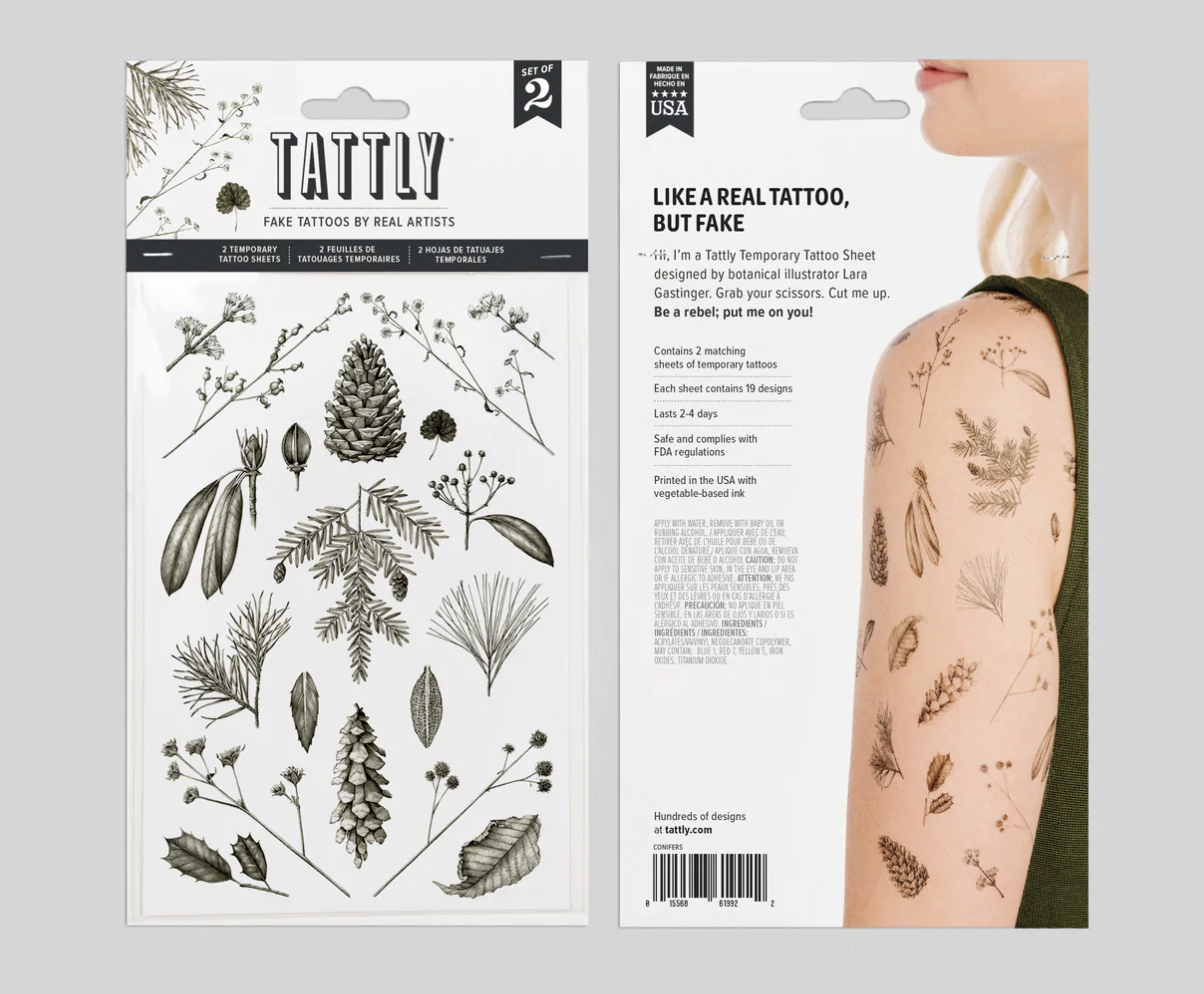 Feel all of the joyful yet relaxing forest vibes with the Conifers Tattoo Sheet by Lara Call Gastinger!