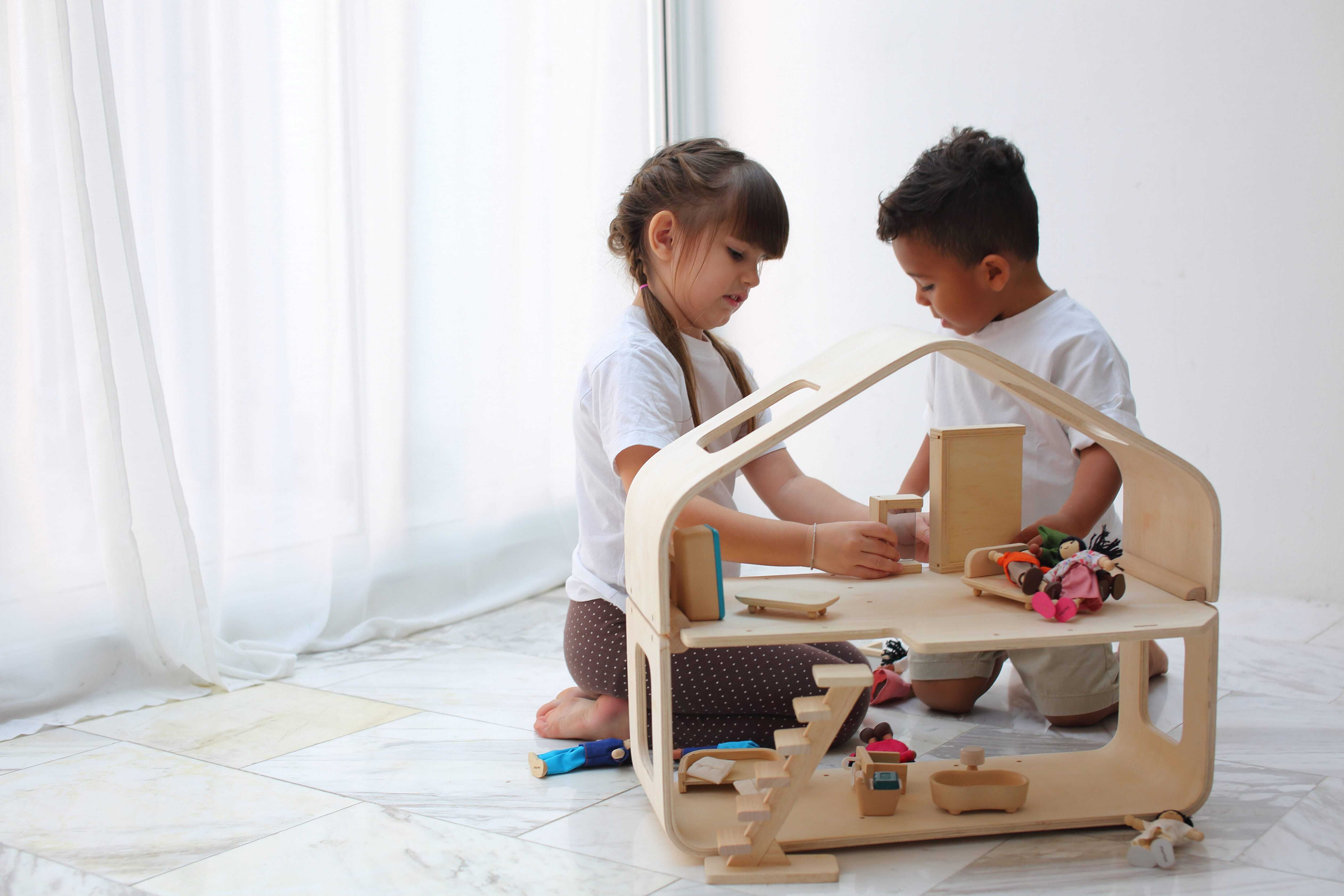 SUSTAINABLY-MADE: Crafted with sustainable wood and free from sharp edges, this dollhouse comes with furniture for a living room, bathroom, bedroom and kitchen. A set of stairs and an adjustable wall help create even more dynamic!