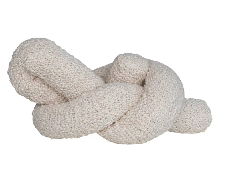 Enhance the home decor with this woven cotton bouclé knot pillow in cream. This pillow features a woven cotton bouclé fabric that creates a soft and cozy feel. The bouclé material is textured and curly, giving the pillow a unique and charming look. The cream color is neutral and elegant and can match any color scheme or theme. The pillow cover showcases an intricate knot design that creates a visually appealing and unique pattern that catches the eye. The knot design adds texture and elegance to the pillow, making it a statement piece in any room. The pillow cover has a sew closure. The pillow is made entirely of high-quality cotton material, which is durable, breathable, and gentle on the skin. The pillow cover and the fill are made of cotton bouclé, a natural and sustainable material that provides comfort and support.