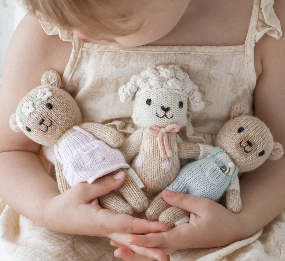 Every cuddle+kind doll is a little work of art, handmade with passion and pride in Peru. They are lovingly hand-knit, hand-loomed, embroidered and crocheted stitch by stitch by artisans using knitting expertise that has been handed down for generations. Every step in the process is carefully considered: from the unique, detailed designs to perfecting and choosing the finest, natural cotton yarns. Each doll is created with quality and care, making them the perfect heirlooms to be handed down from one lucky baby to the next.