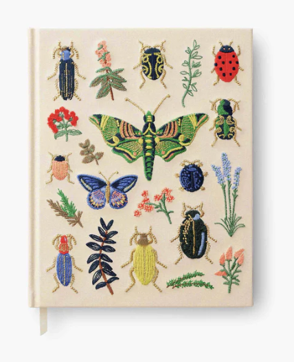 Our embroidered sketchbook is a large, hardcover journal with 108 unlined pages of thick paper perfect for sketching, drawing, and journaling. The cover is wrapped in cream book cloth and embroidered with the beetles and bugs of our Curio print with metallic gold accents. An attached grosgrain ribbon bookmark will save your place.