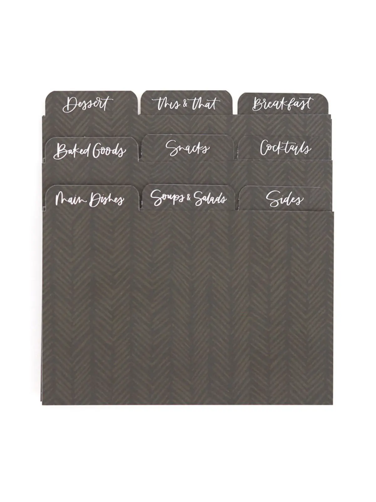 Format | Set of 9 Features | Hand-painted designs. Sections for snacks, cocktails, soups & salads, sides, main dishes, breakfast, baked goods, dessert, this & that. Size | 4″ x 6″ with 0.5″ tall tab