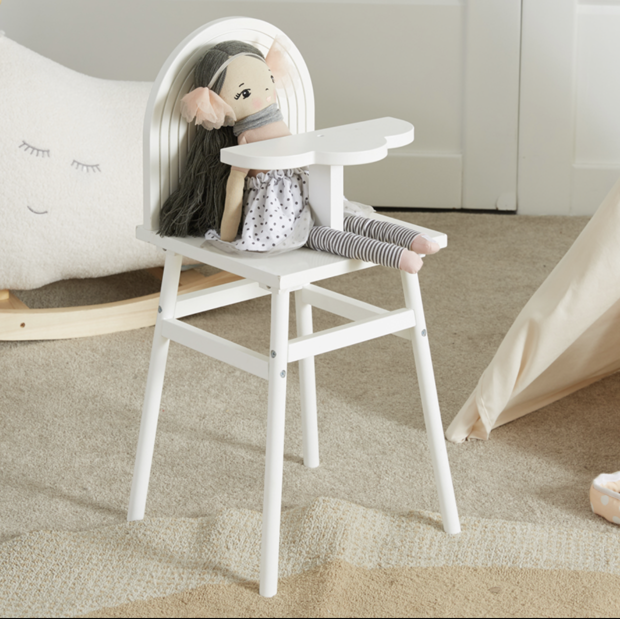 Dolly will enjoy their meal in our Dreamy Doll High Chair. Crafted of sturdy pine and plywood, and non-toxic paint, our doll high chair is a perfect fit for all of our dolls. The cloud shaped tray and etched rainbow seatback make this doll high chair super dreamy! Simple assembly. Intended for use with dolls only.