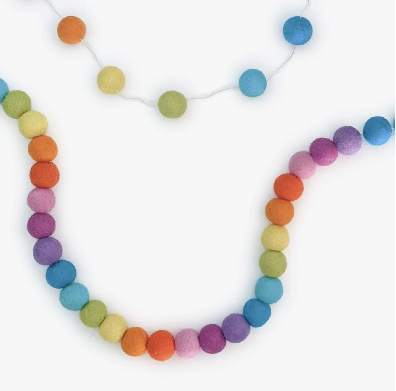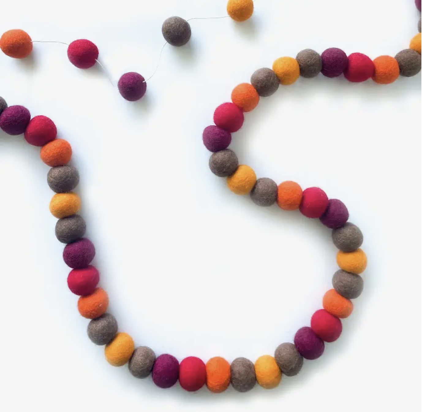 Wool beads are 1″ (2.5cm), and the garlands come with extra thread so you can play around with length. Space the beads 1″ to 4″ apart, or leave them touching. This makes the range of the garland 7 ft-25ft. Perfect to decorate doors, walls, windows, porch, fireplace, and much more!