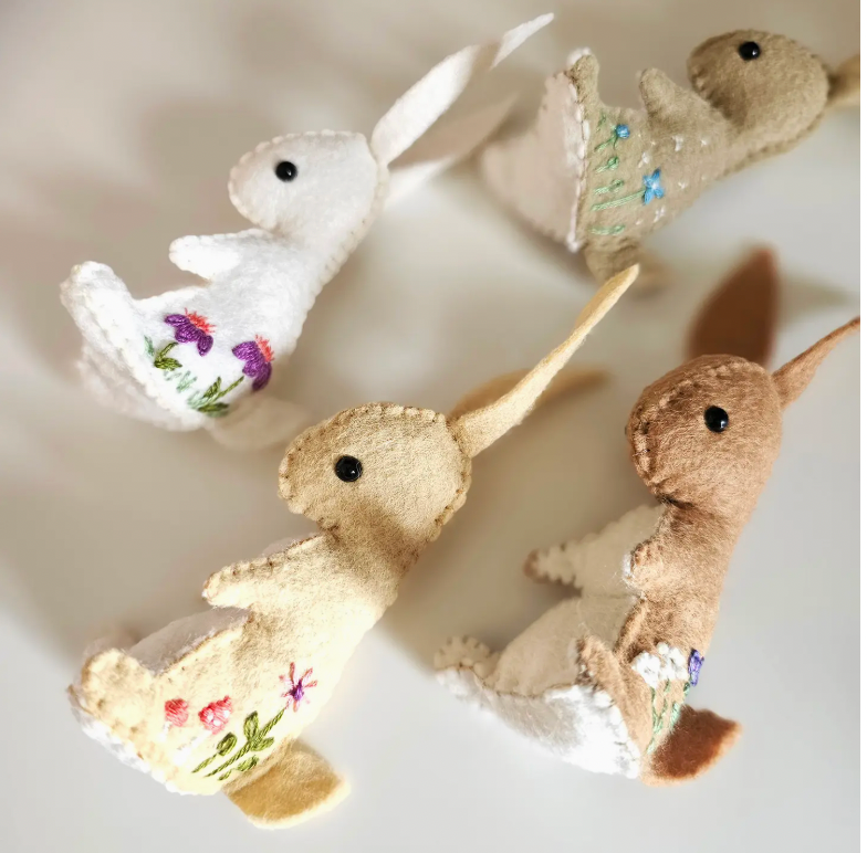 This DIY Felt Bunny Sewing Craft Kit by DelilahIris Designs includes enough felt materials and supplies to make a four beautiful hand sewn felt mini bunnies with charming floral and mushroom embroidery patterns. All supplies come to you in a nifty recycled kraft paper box. A wonderful project to practice or teach yourself hand sewing and how to make your own felt stuffed animals. DelilahIris craft kits are a wonderful gift for your favorite crafty friend! What's in the box? felt bunny pattern and top quality merino wool felt digital tutorials on a dedicated website needle and thread embroidery floss doll eyes toy stuffing This kit is designed to be hand stitched. No sewing machine required! Sewing Skills: Beginner/intermediate. A adult beginner to sewing can handle this kit, or an experienced child with adult supervision.