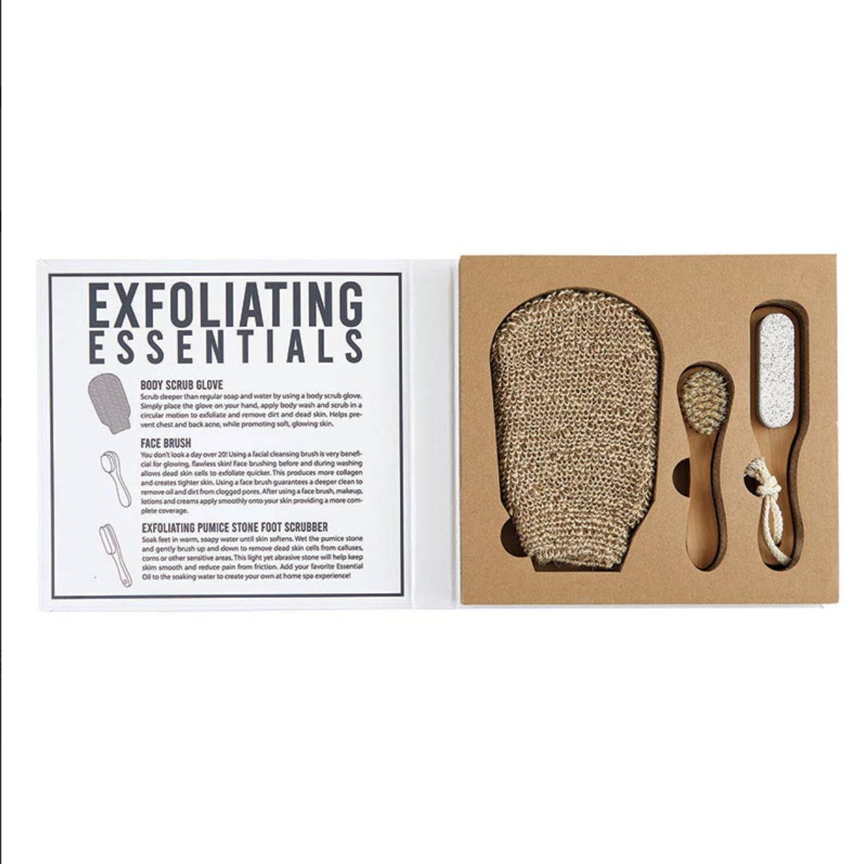 This unique matte white box kit makes a great gift for any self-care advocate. Includes 1 hemp glove for body and face exfoliation, 1 pumice stone foot scrubber, and 1 soft boar bristle face brush for gentle exfoliation.