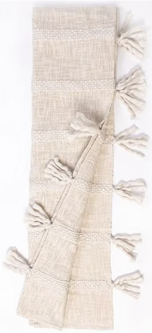Subtle, yet statement, this throw is weaves slubby cotton in the warp and weft creating a light-weight texture all over, with plush bulky yarn running horizontally creating a textural stripe. Finished with hand tied tassels on each either side.