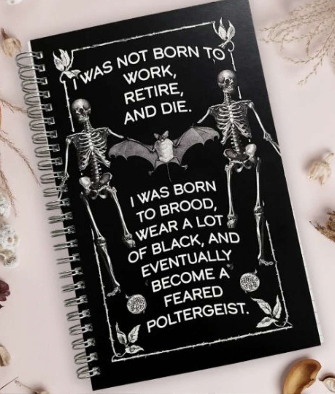 This funny goth notebook makes a great gift for the horror fan in your life. Our original quote is paired with skeletons and bats for that perfect spooky vibe. It’s a notebook even the grim reaper would approve of.