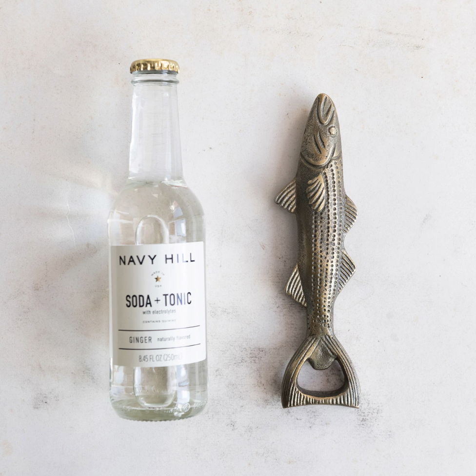 This coastal inspired bottle opener features the whimsical silhouette of a fish in gilded aluminum.