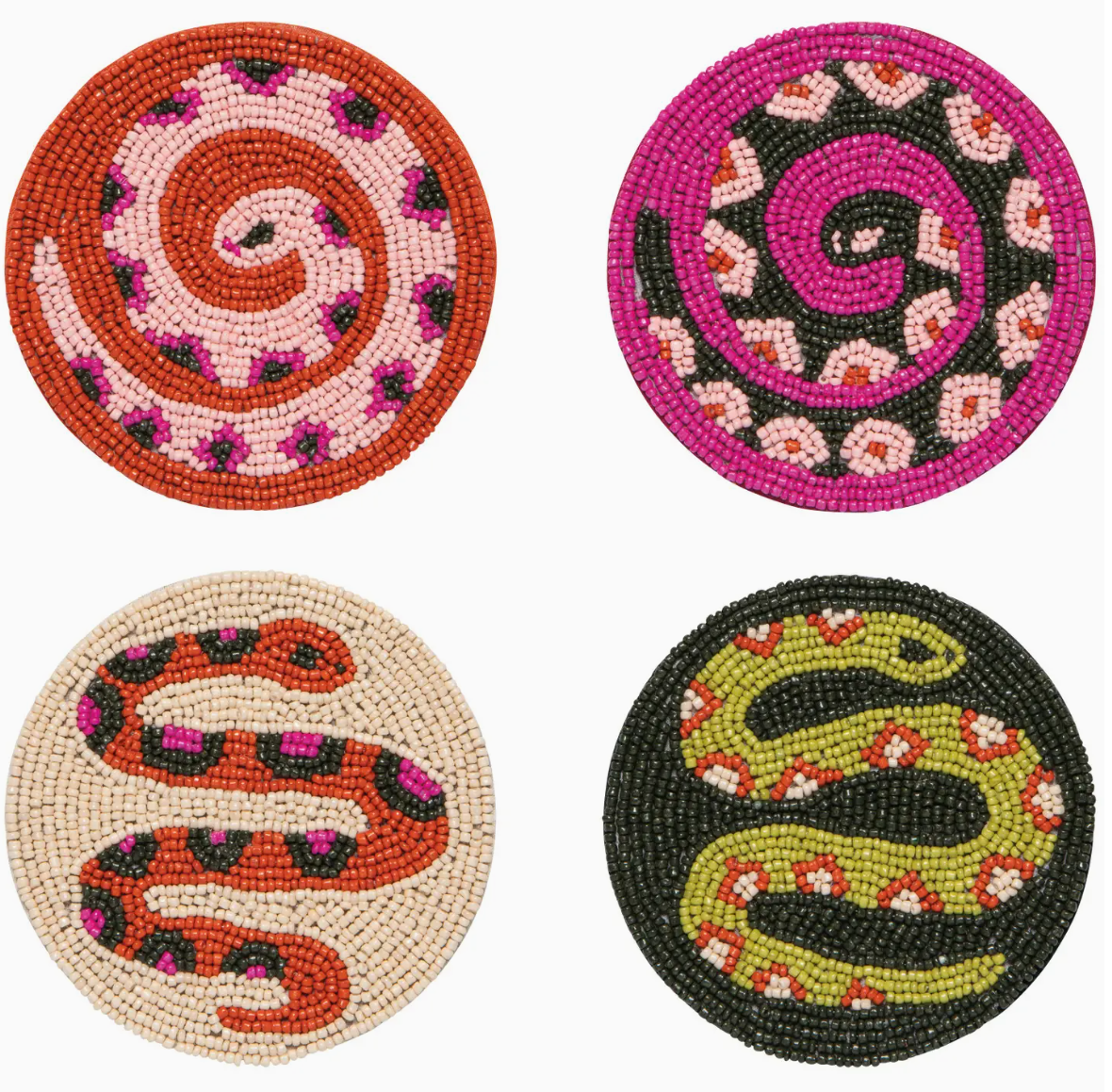 Danica Studio designs radiate from the surface of our hand-beaded coaster set from the Gardenland collection. With earthy greens, bold pops of pink and citron, these coasters give a magnified glimpse of slithering snakes in the garden. Crafted with dyed glass beads and a strong fabric core, these little beauties are made to last.