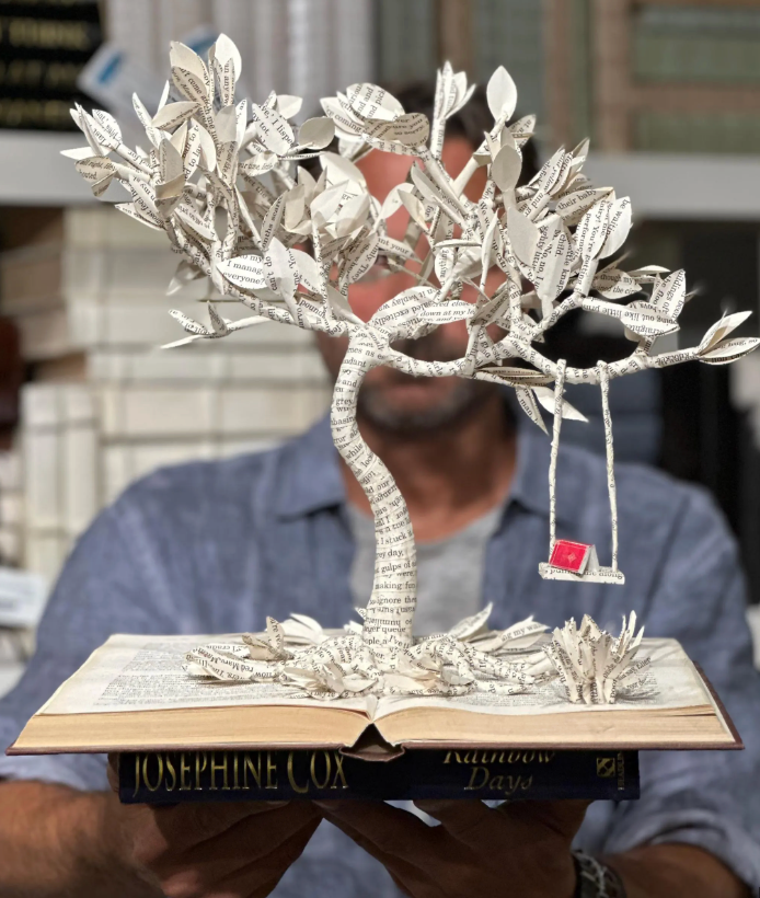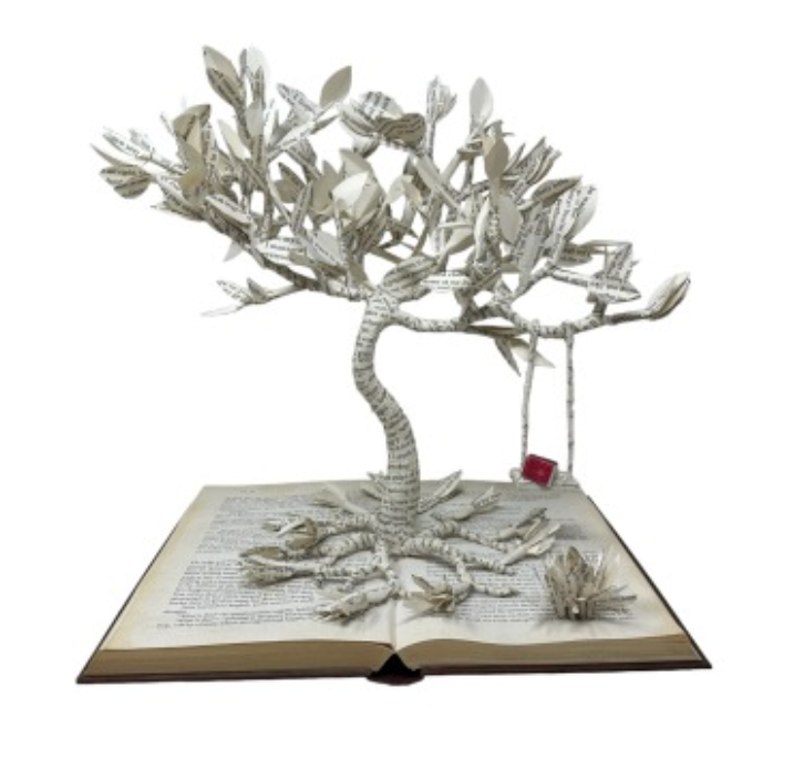 Beautiful book sculpture made by hand. We do fasten another book underneath as a riser so it looks like it “floats” and it keeps it in place. Ships in an mdf box, all you have to do is unscrew two screws to release the sculpture.