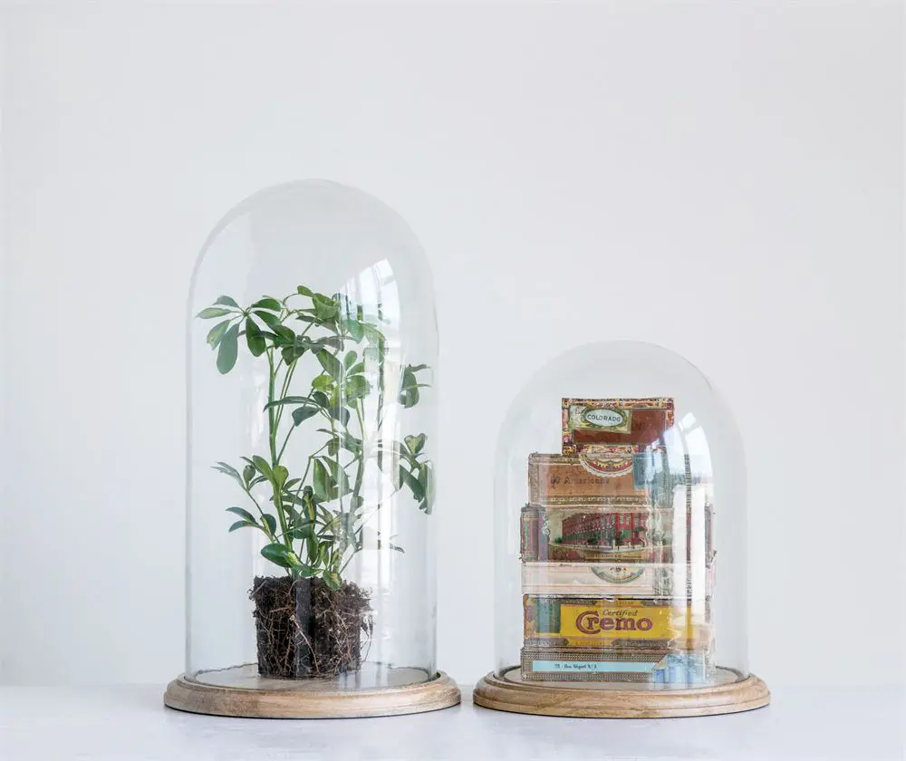 Glass Cloche on Wood Base, 17″H (Set of 2)