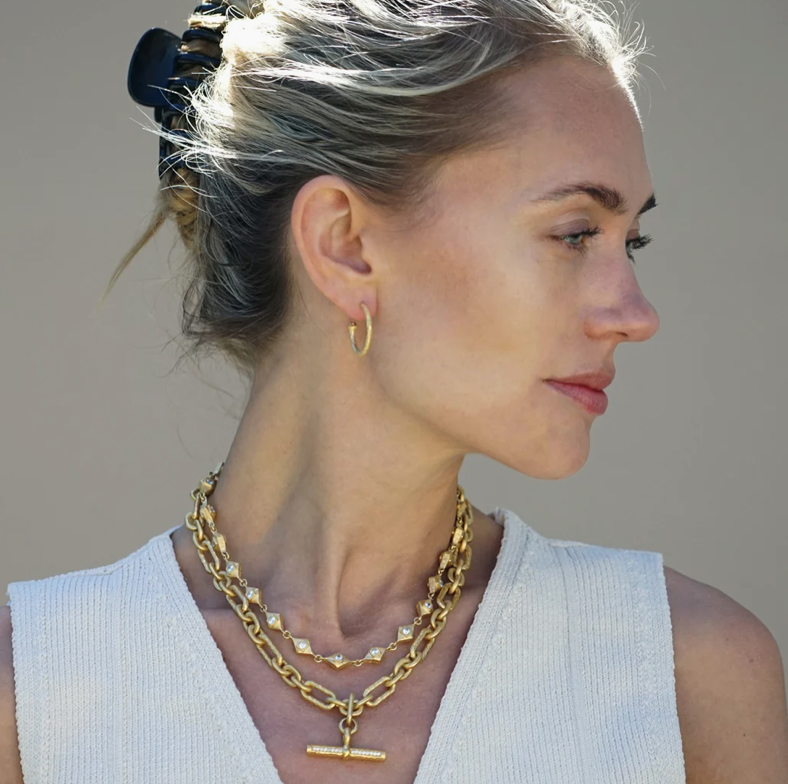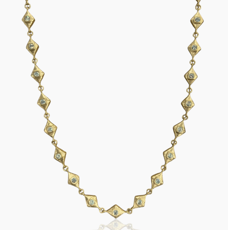 With 14K gold plated brushed and hammered metal, this necklace is the perfect addition to any chic outfit. Custom diamond-shaped segments, round cut cubic zirconia and toggle closure make this necklace incredibly eye catching. 18″ total length