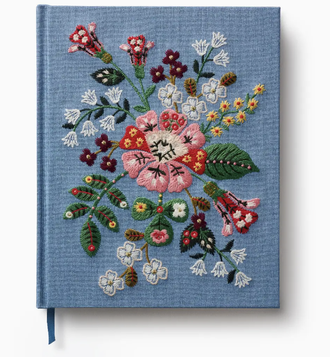 Our embroidered sketchbook is a large, hardcover journal with 108 unlined pages, perfect for sketching, drawing, and journaling. The cover is wrapped in blue book cloth and embroidered with our Gracie florals. Inside, an attached grosgrain ribbon bookmark will save your place.
