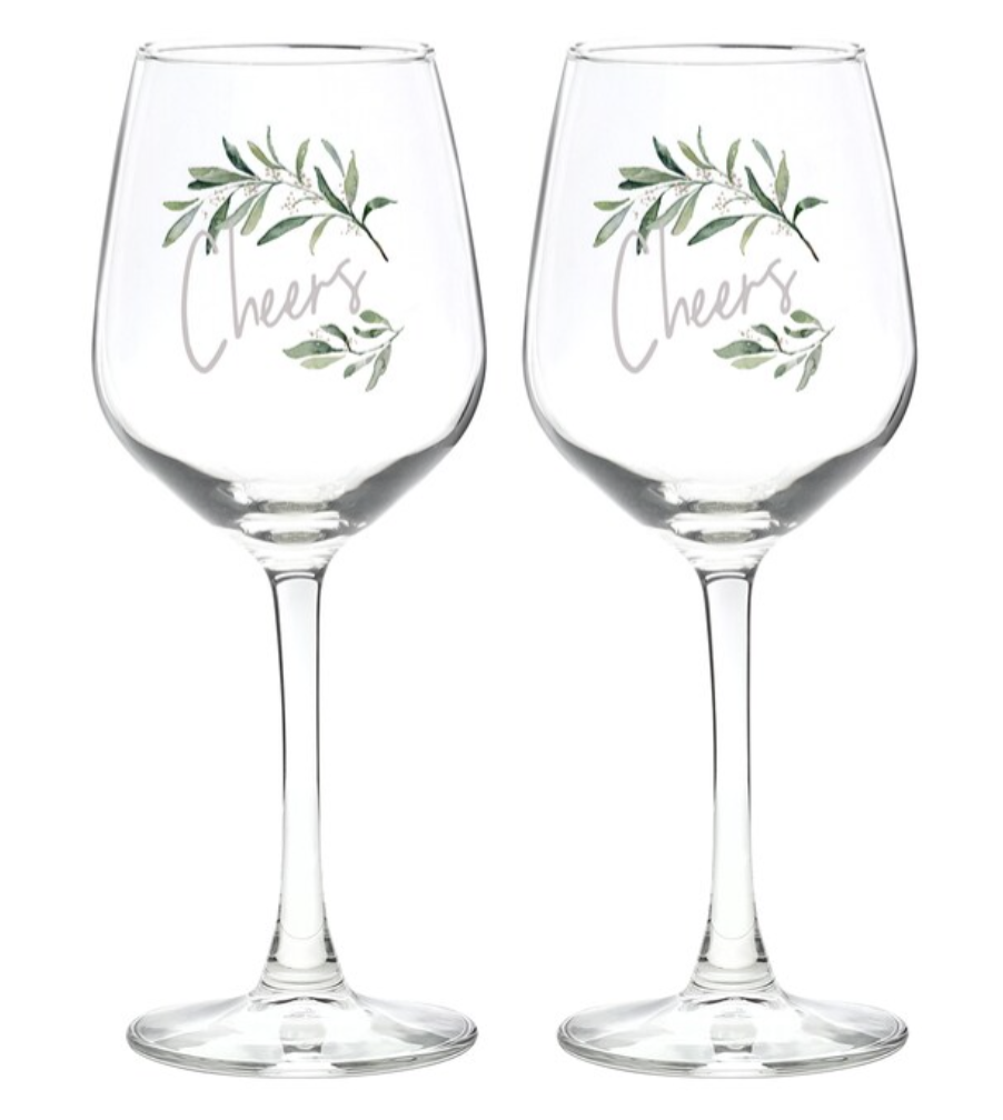 Let the happy couple toast with wine glasses featuring "Cheers" bordered by a fresh greenery design.