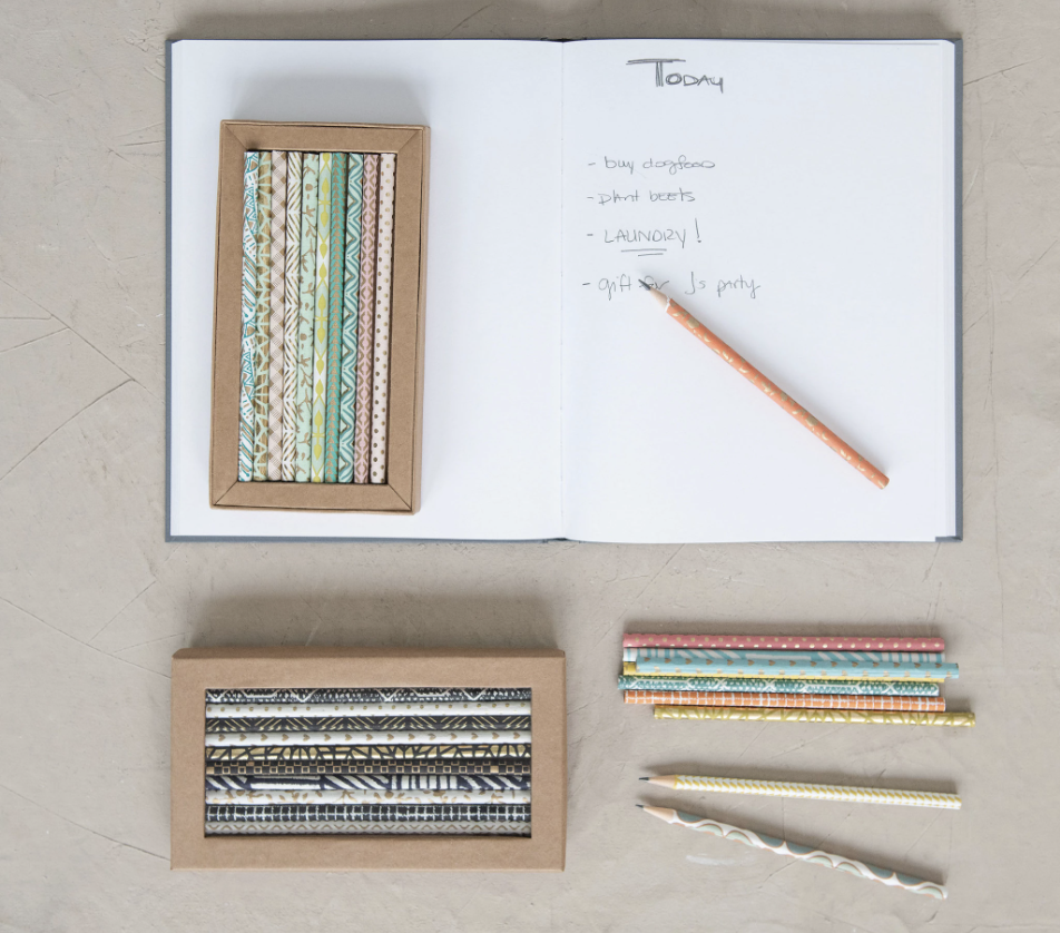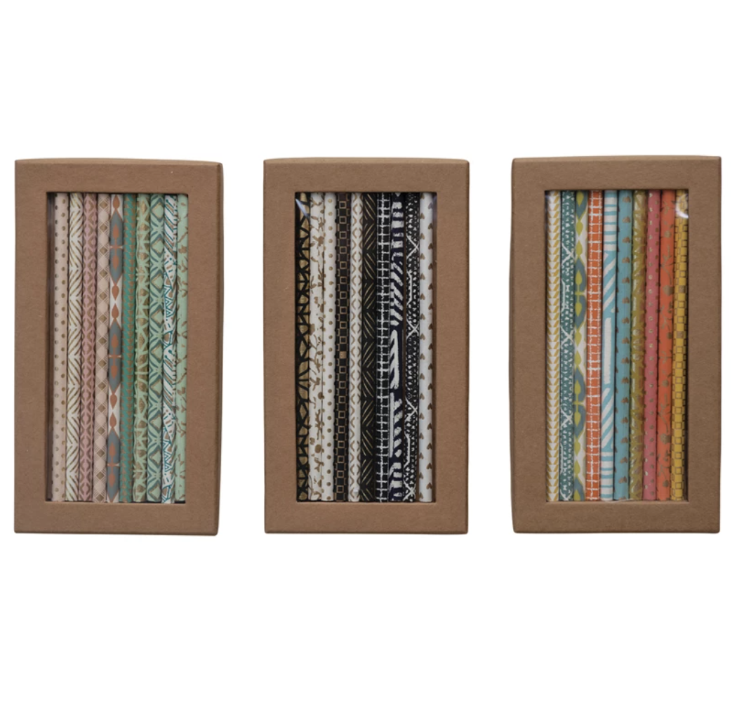 7″L Handmade Paper Wrapped Wood Pencils w/ Patterns in Kraft Box, Set of 10, 3 Styles