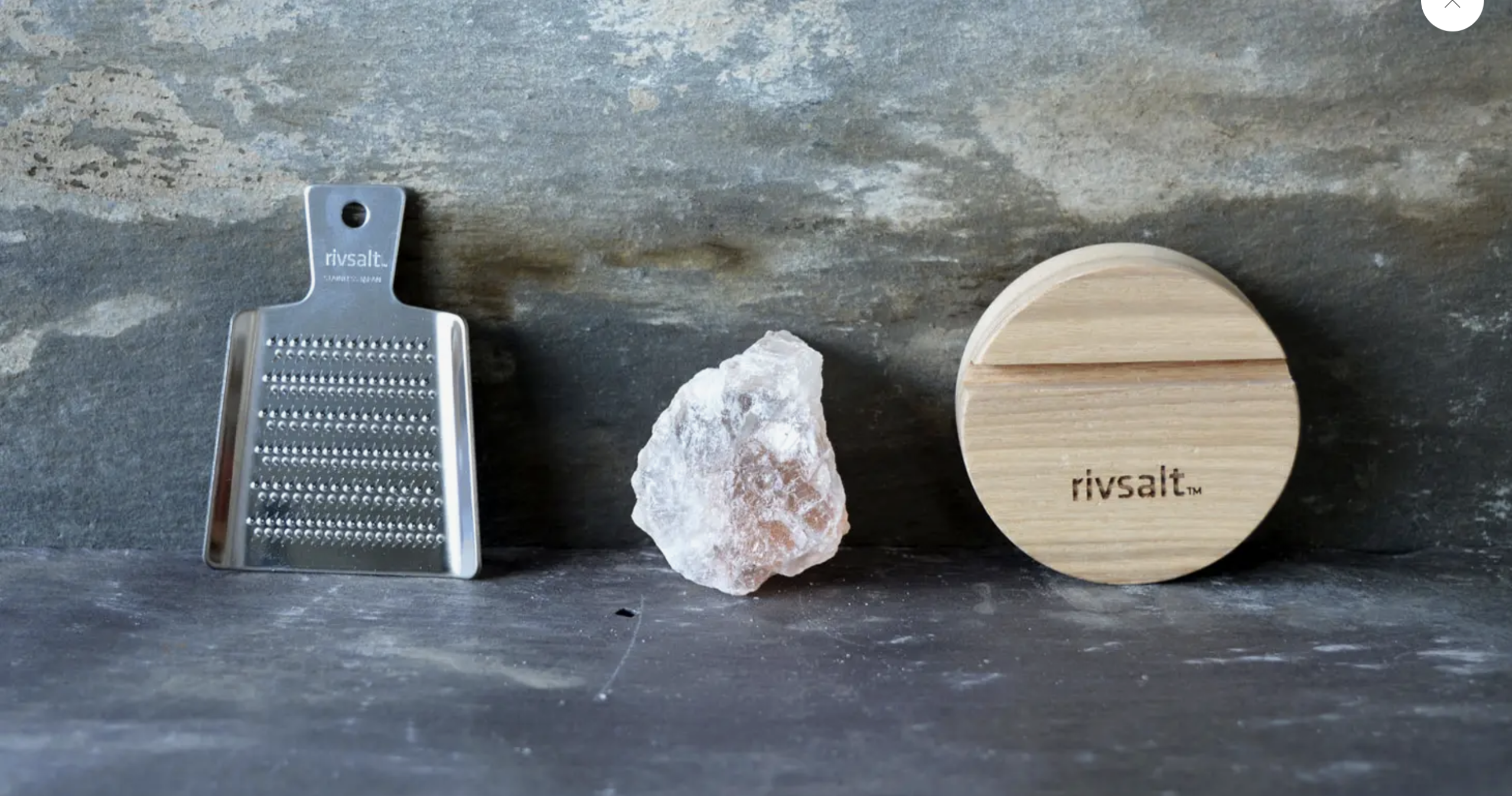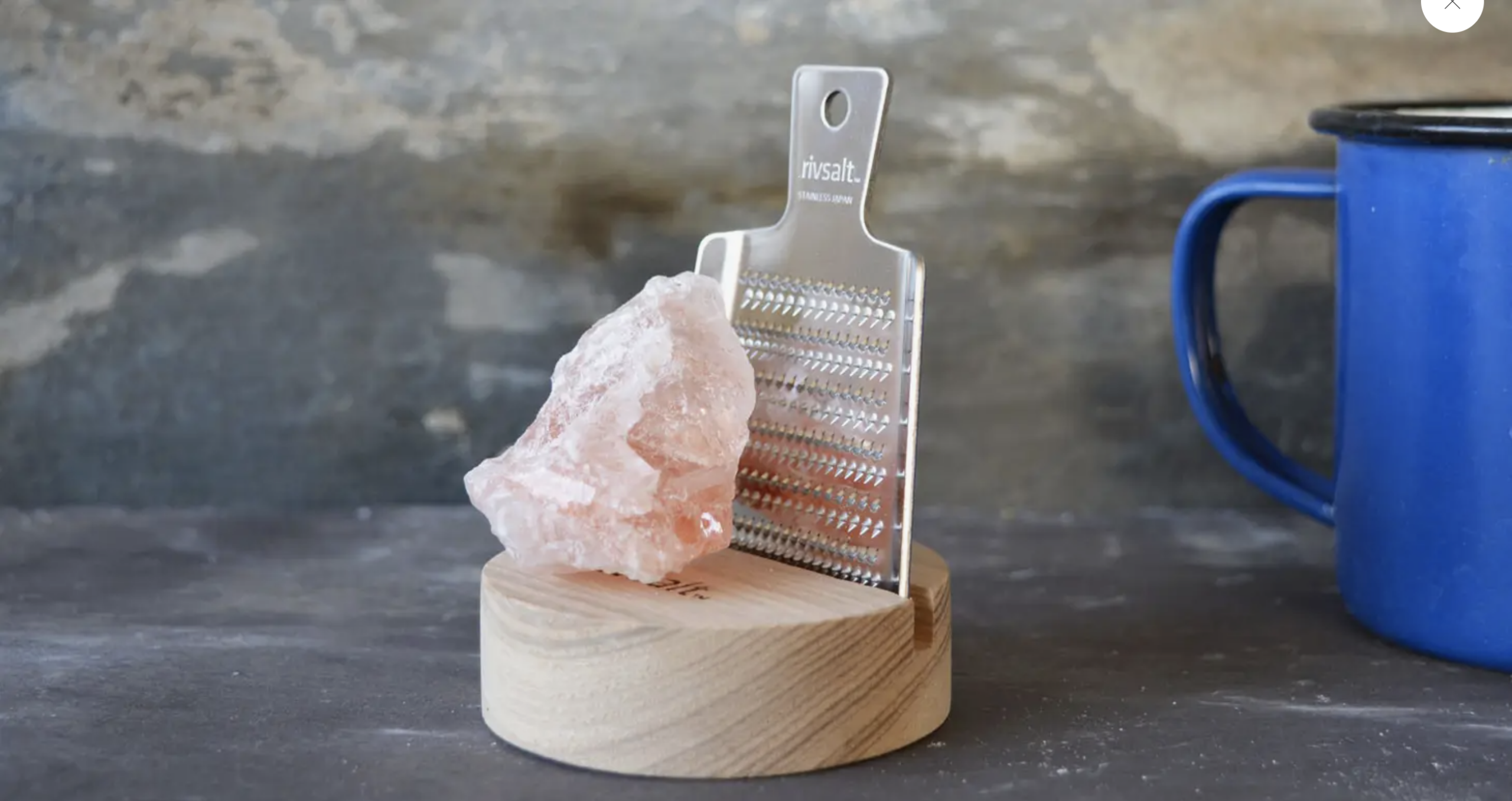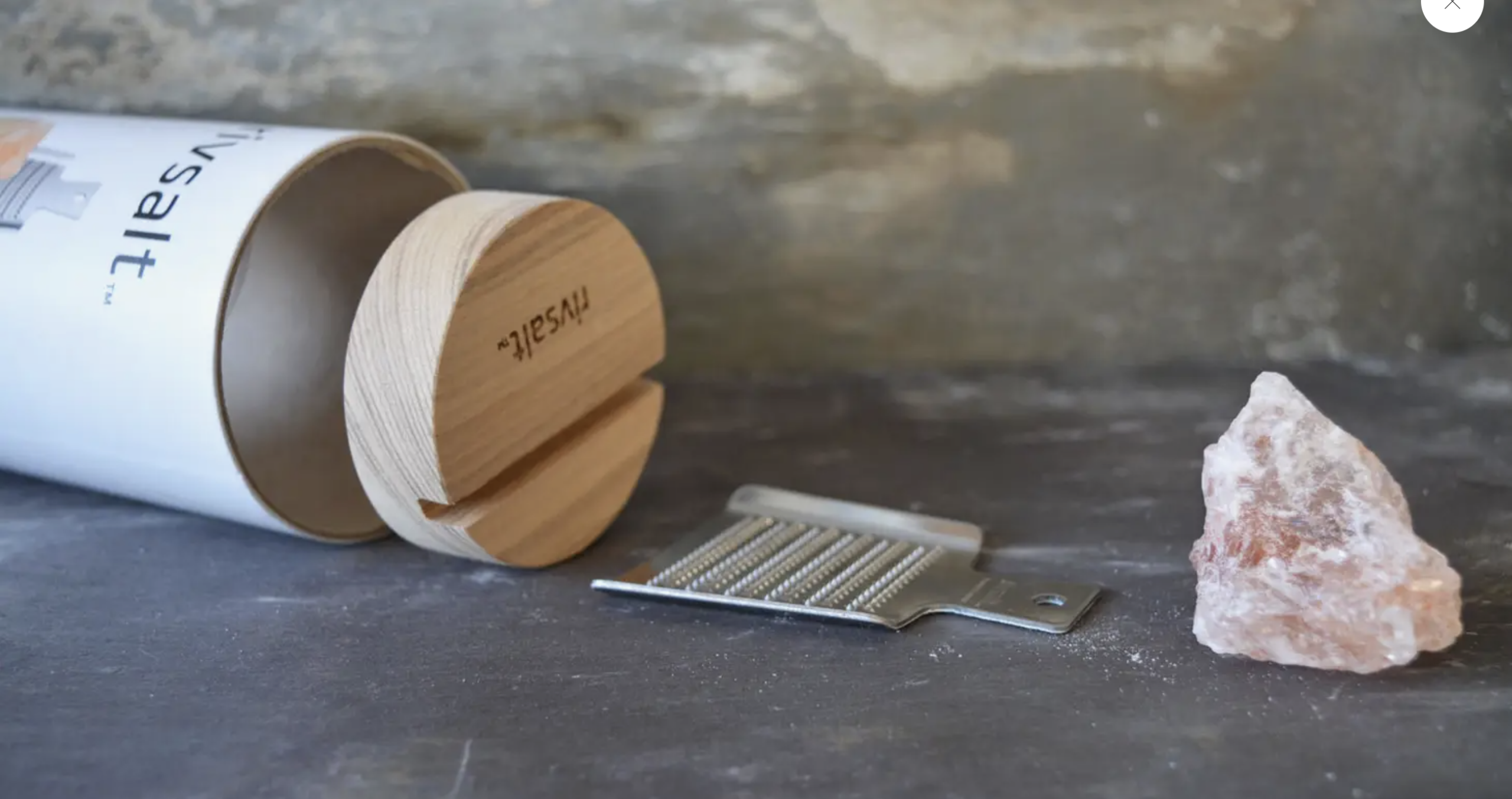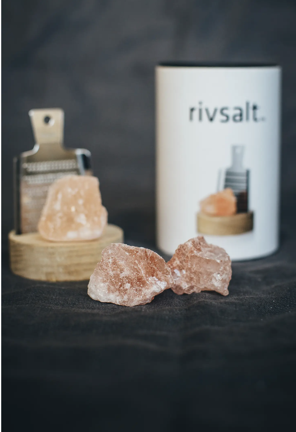 This the original RIVSALT™ product includes a Japanese style grater, a Himalayan salt rock and a desk stand made from untreated natural oak.