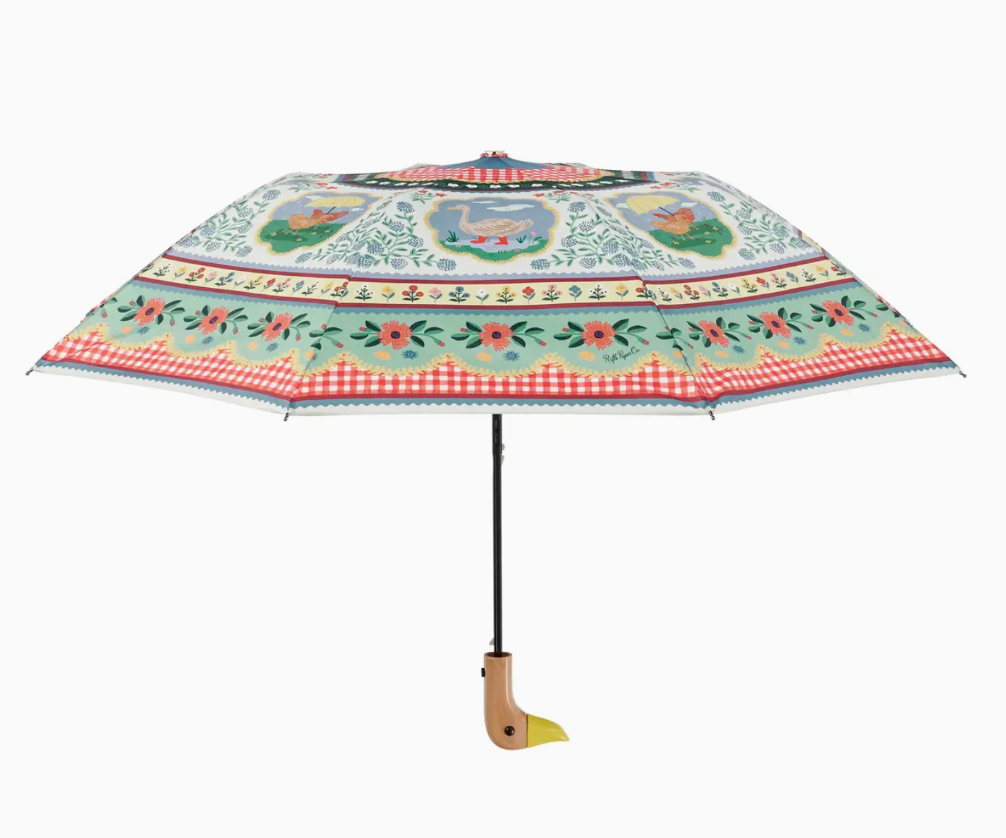 No rainy day blues here. Easily portable, our Home Sweet Home umbrella has a patterned sleeve, an auto open function, a wrist strap, and a classic wooden duck handle for an extra dose of charm. DETAILS – Auto open and close – Wooden handle – Embossed logo button and wrist strap – Folds up to a portable size – Matching storage sleeve – 43″ open diameter – 11.25″ L closed