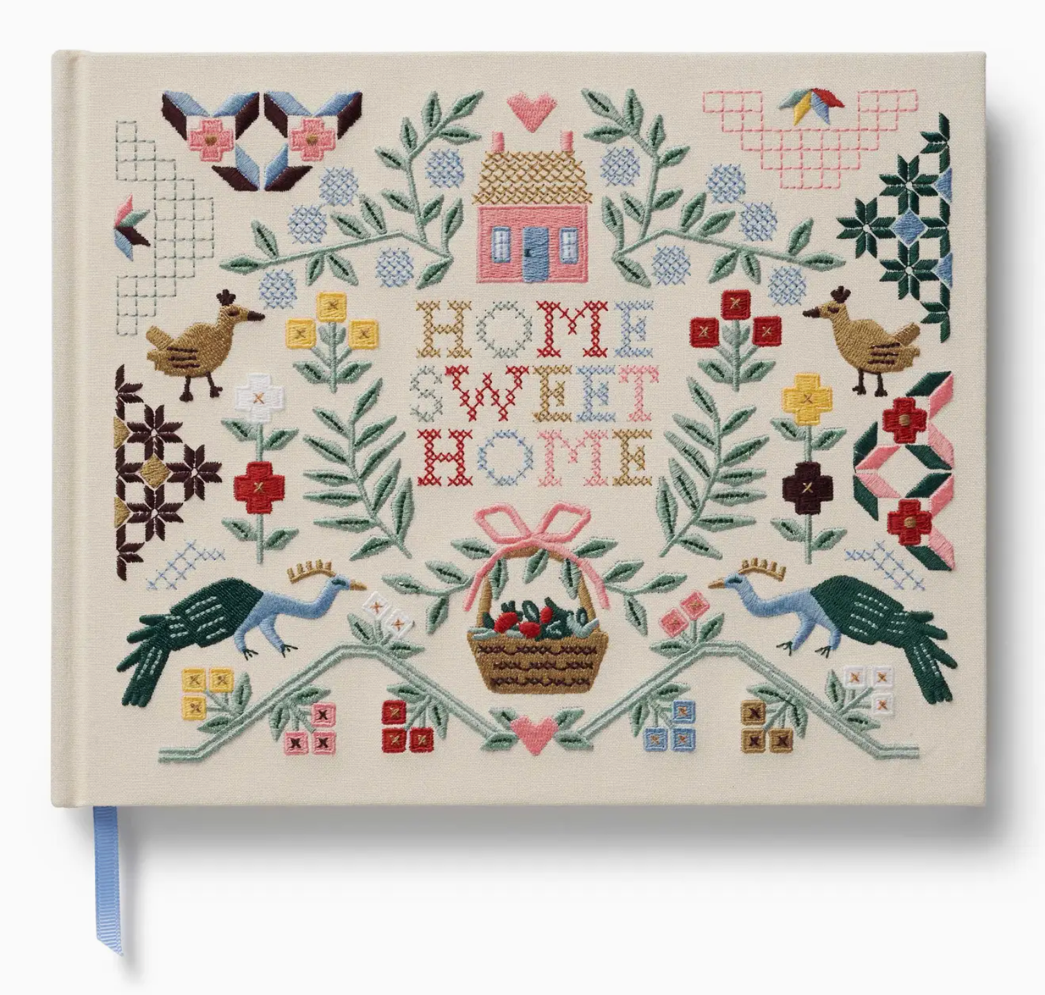 A one-of-a-kind keepsake, our embroidered guest book is a large, hardcover journal with 144 interior pages, half lined and half blank so guests can write a note, add a sketch, or paste a photo. The cover is wrapped in book cloth and embroidered. A grosgrain ribbon bookmark saves your place. DETAILS – Book cloth cover with 100gsm ivory uncoated paper – Natural white text paper – Embroidery on front cover – Grosgrain ribbon bookmark – 144 lined and blank pages – Lay-flat finding – Acid free paper – 10.25″ W x 8.25″ L x 0.625″ H