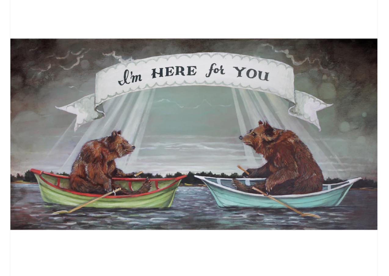 Original artwork of bear friends in boats by Elizabeth Foster, interpreted into a card with "I'm Here for You" message. Packaged with kraft envelope.
