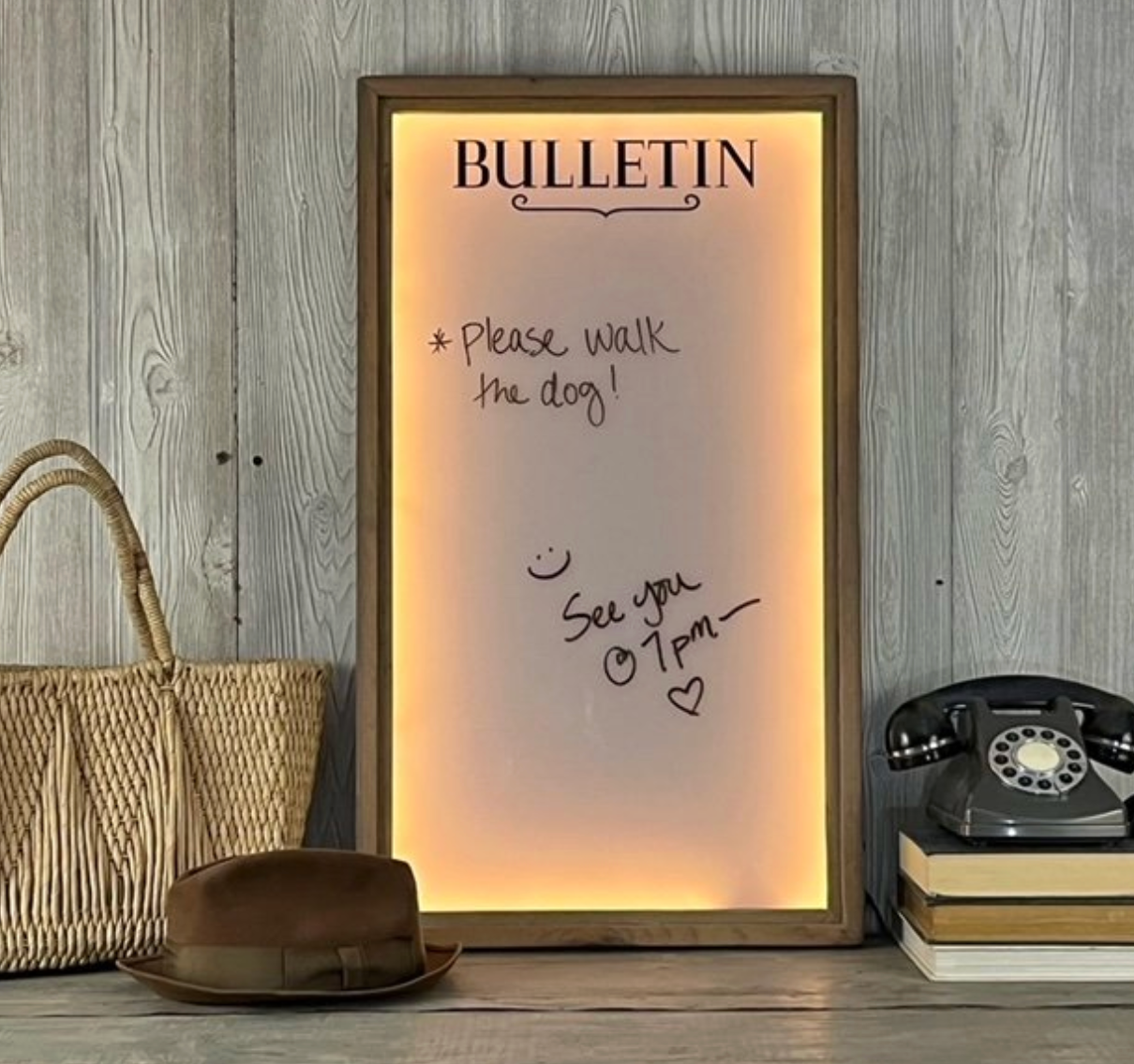 This backlit message board will add interest to your home office or mudroom! Framed in reclaimed wood, this frosted plexiglass dry erase board has decorative lettering that reads “Bulletin” at the top.