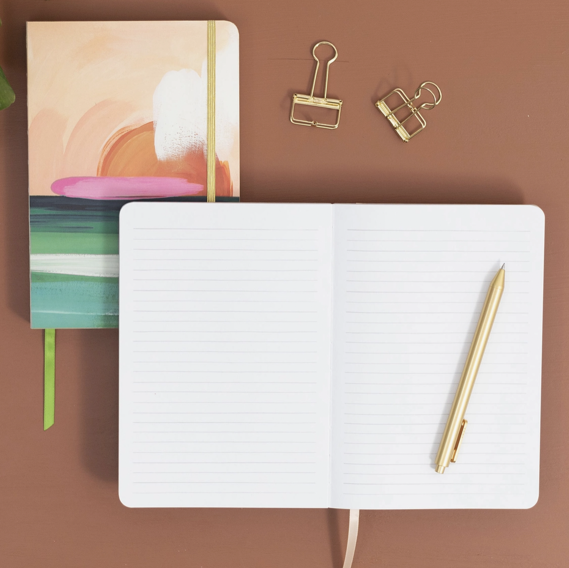 Features | Laminated hardcover, exposed lay flat binding, gold elastic closure, ribbon bookmark Interior | 160 lined pages, 160 gsm paper Size | 5.5″ x 8″ x 7/8″ thick