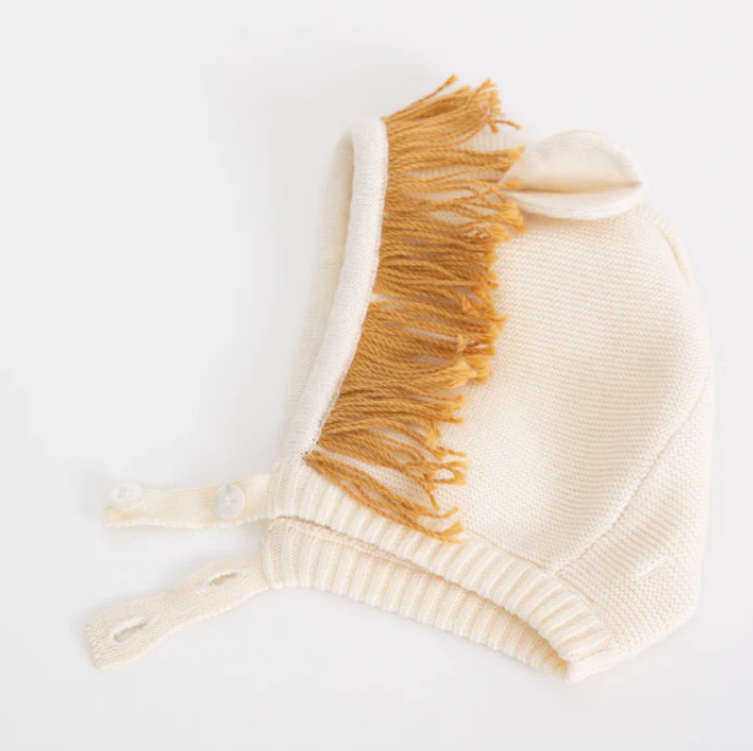 Roar! The king of the jungle has never looked so adorable! Transform a little one into a super cute beast with our Lion Baby Bonnet. Beautifully crafted from soft organic knitted cotton with cotton thread fringe and ear detail. Finished with a gorgeous ivory button fastening.