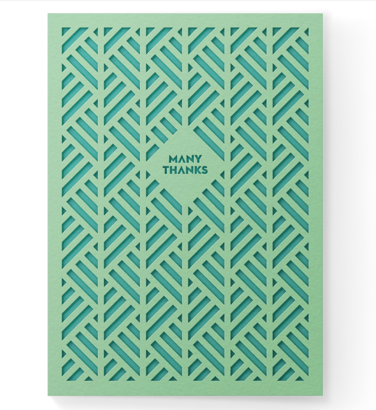 Tactile pattern and fresh color sets the stage for a stylish statement of gratitude. Equally suitable for a casual or special thanks.