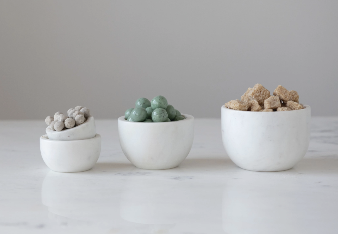 These small marble bowls are the perfect addition to any home. Their neutral white color allows them to blend in seamlessly with any other decor, yet still make a statement. They is perfect for any small items and are stackable for easy storage. They come in a set of 4.