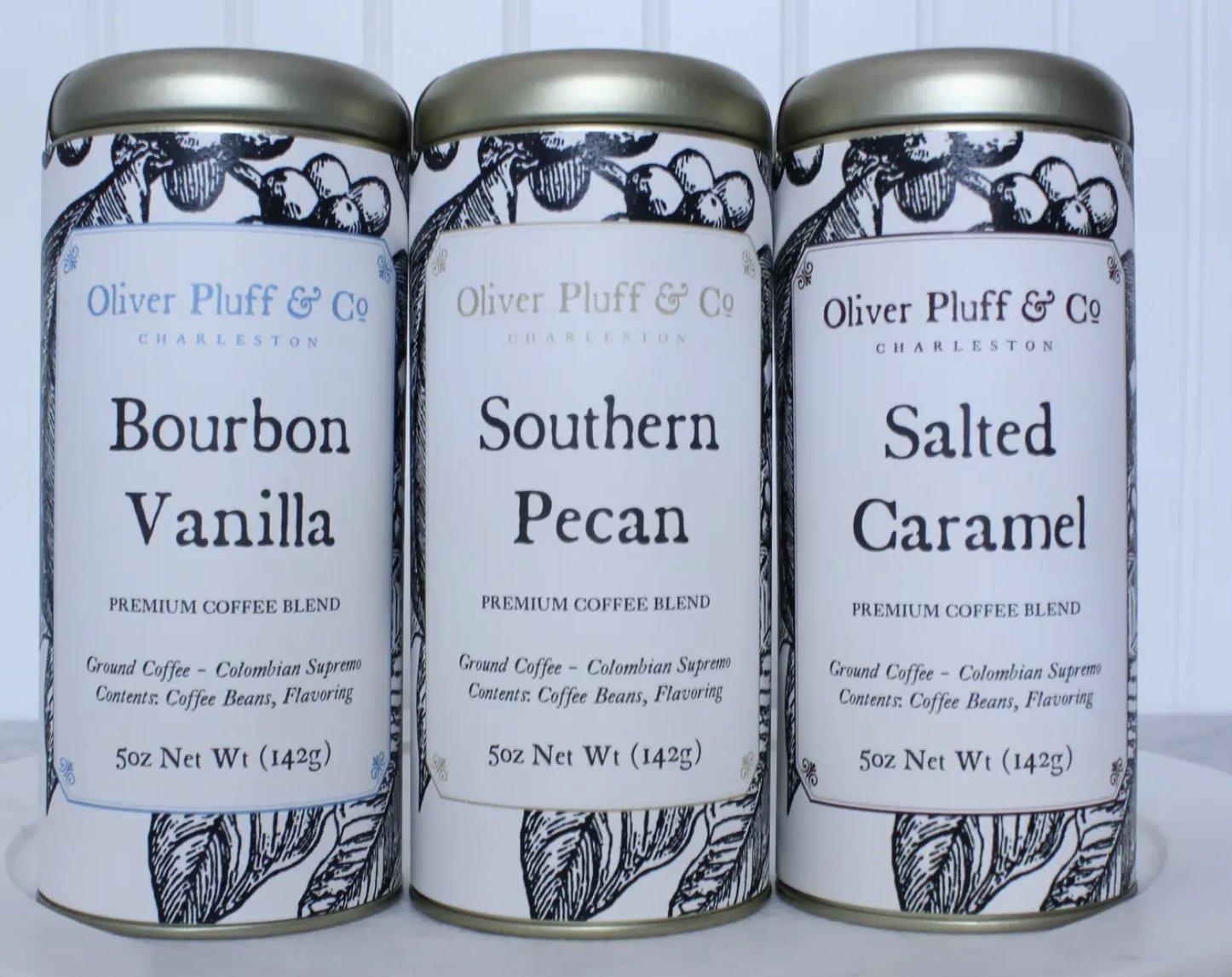 Description: Market Street Coffee Trio. Our 3 most popular flavored coffees — Southern Pecan, Bourbon Vanilla, and Salted Caramel. Colombian beans yield a bold brew that serves as a rich coffee base for a wide variety of flavored coffees.