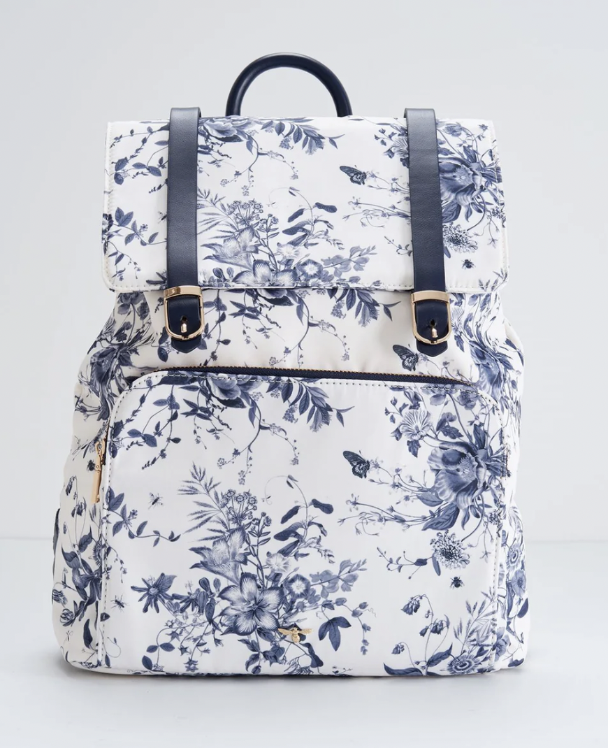 Our Martha Large Backpack will soon become your daily staple. The application of our Blooming Toile print featuring clusters of delicate bouquets arranged amongst trailing vines, dotted with dragonflies, bees and butterflies in a calming palette of tonal blues, will bring added joy to everyday trips. With a zipped front pocket, two inner pockets and a roomy interior this piece is ideal for the daily commute or weekend adventures alike. The addition of buckled, blue vegan leather straps adds a touch of vintage charm to this essential piece.