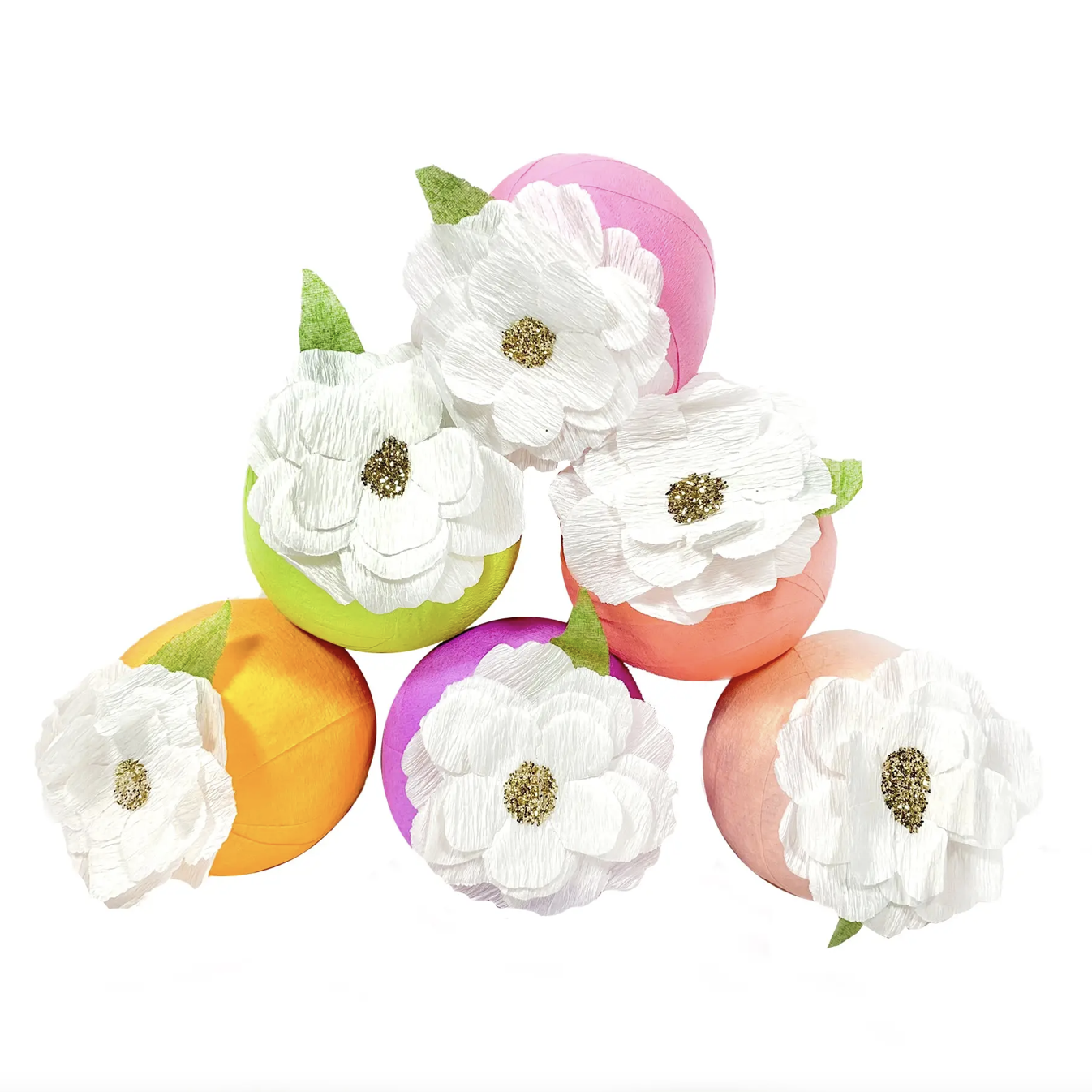These mini Surprize Ball® flowers have 5 varied gifts hidden inside the layers of crepe paper ribbon.